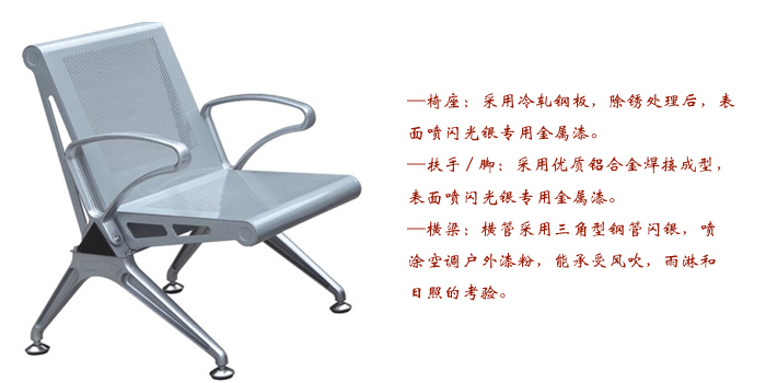 1、座面:采用冷轧钢板,除绣处理后,表面喷闪光银专用金属漆。2、扶手/脚:采用优质铝合金焊接成型,表面喷闪光银专用金属漆。