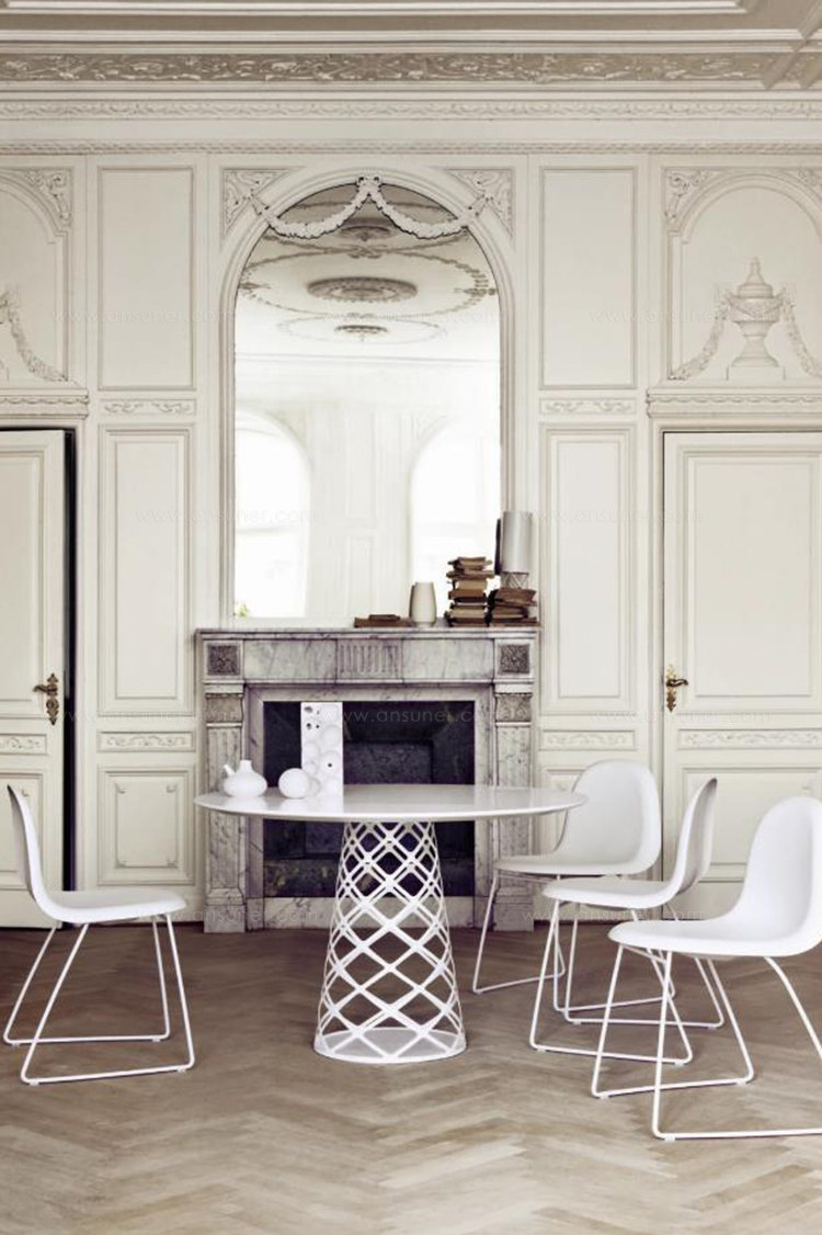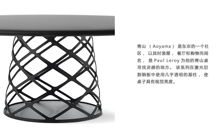 青山(Aoyama)是东京的一个社区,以其时装屋,餐厅和购物而闻名,是Paul Leroy为他的青山桌寻找灵感的地方。 该表系列在激光切割钢板中使用几乎透明的基柱,使桌子具有视觉亮度。 单基柱表可以支撑圆形桌面,而两个基柱可以支持带圆边的矩形桌面。