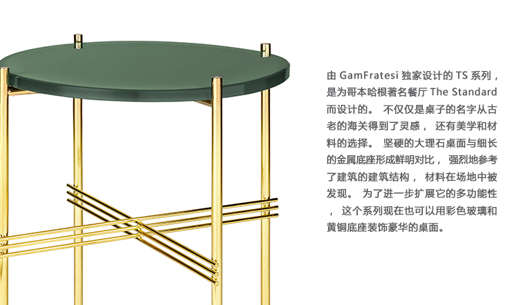 由GamFratesi独家设计的TS系列,是为哥本哈根著名餐厅The Standard而设计的。不仅仅是桌子的名字从古老的海关得到了灵感,还有美学和材料的选择。坚硬的大理石桌面与细长的金属底座形成鲜明对比,强烈地参考了建筑的建筑结构,材料在场地中被发现。为了进一步扩展它的多功能性,这个系列现在也可以用彩色玻璃和黄铜底座装饰豪华的桌面。TS集合由一张躺椅、一个矩形和一个圆形控制台组成,有不同的大小和颜色组合,因此可以根据大小、颜色和组合的表的数量创建不同的表达式和函数。然而,它们本身是美丽的。