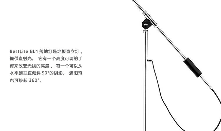 BestLITE BL3&BL4落地灯是地板直立灯,提供直射光。它有一个高度可调的手臂来改变光线的高度,有一个可以从水平到垂直倾斜90°的阴影。遮阳帘也可旋转360°。