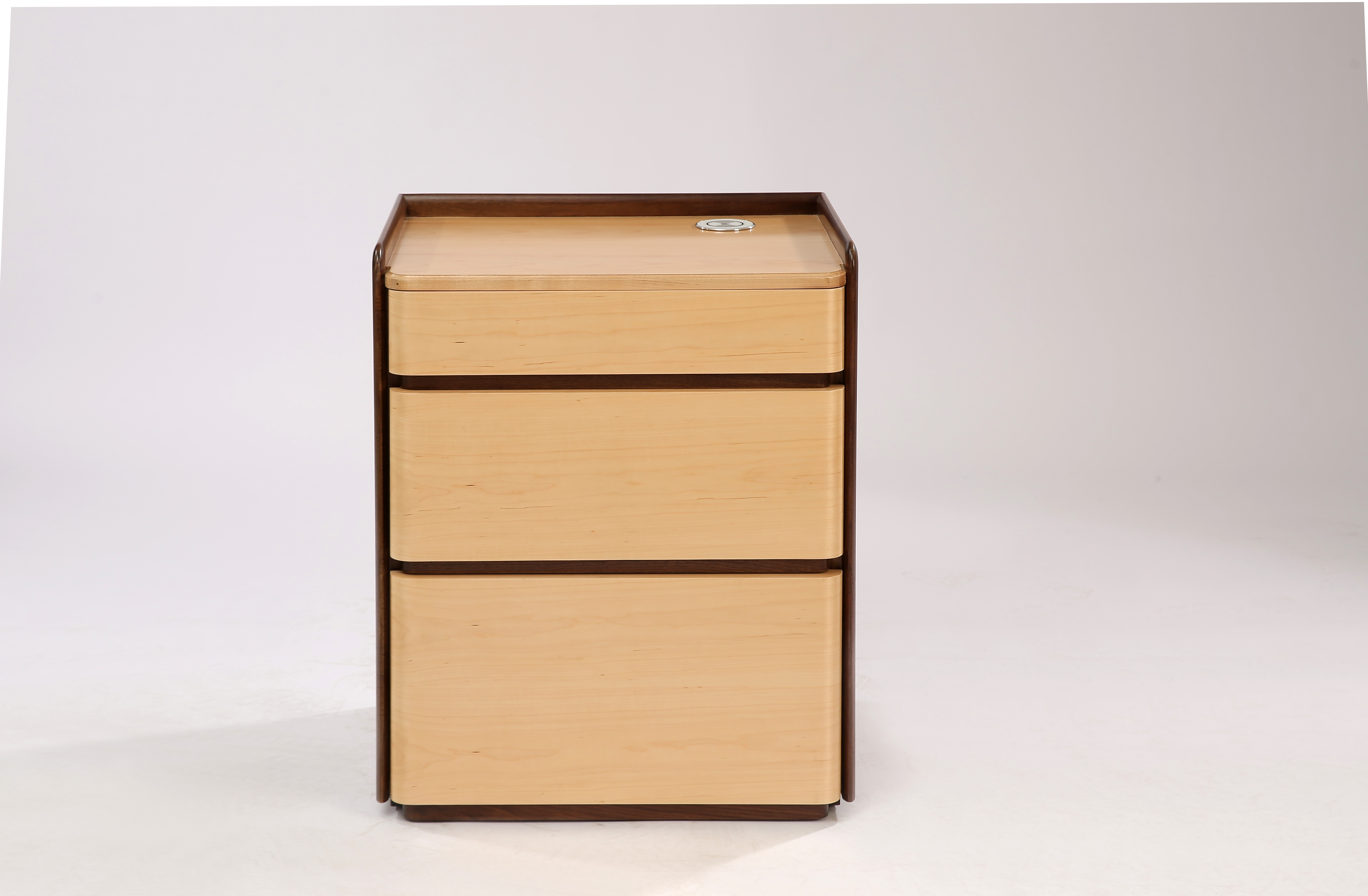 床边柜造型现代简洁优雅,三面围边稍高于柜体面板,以防止物品的掉落。三个抽屉的床头柜用于主卧,配备无线充功能,两个抽屉的床头柜用于客卧,也可以混搭使用。
