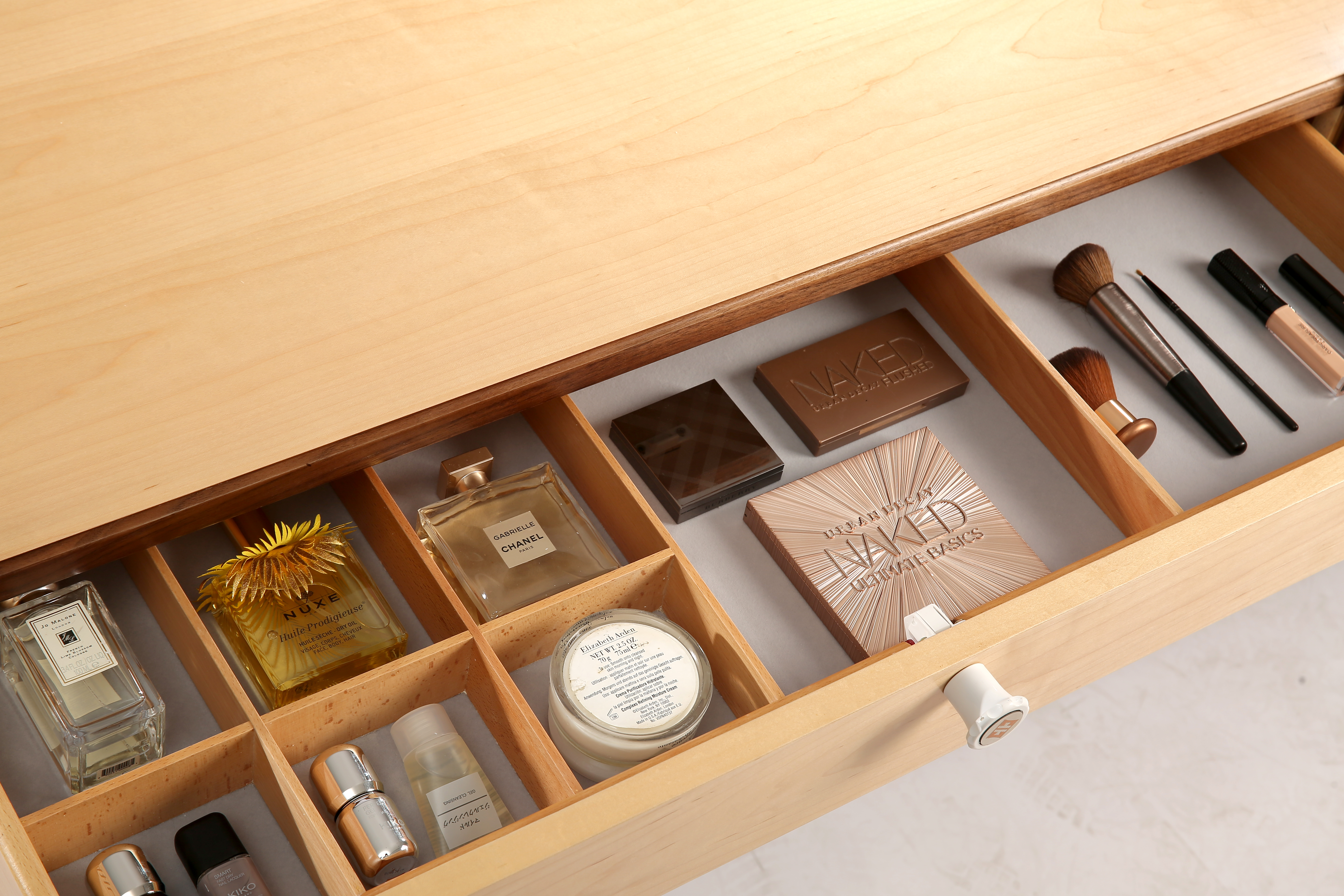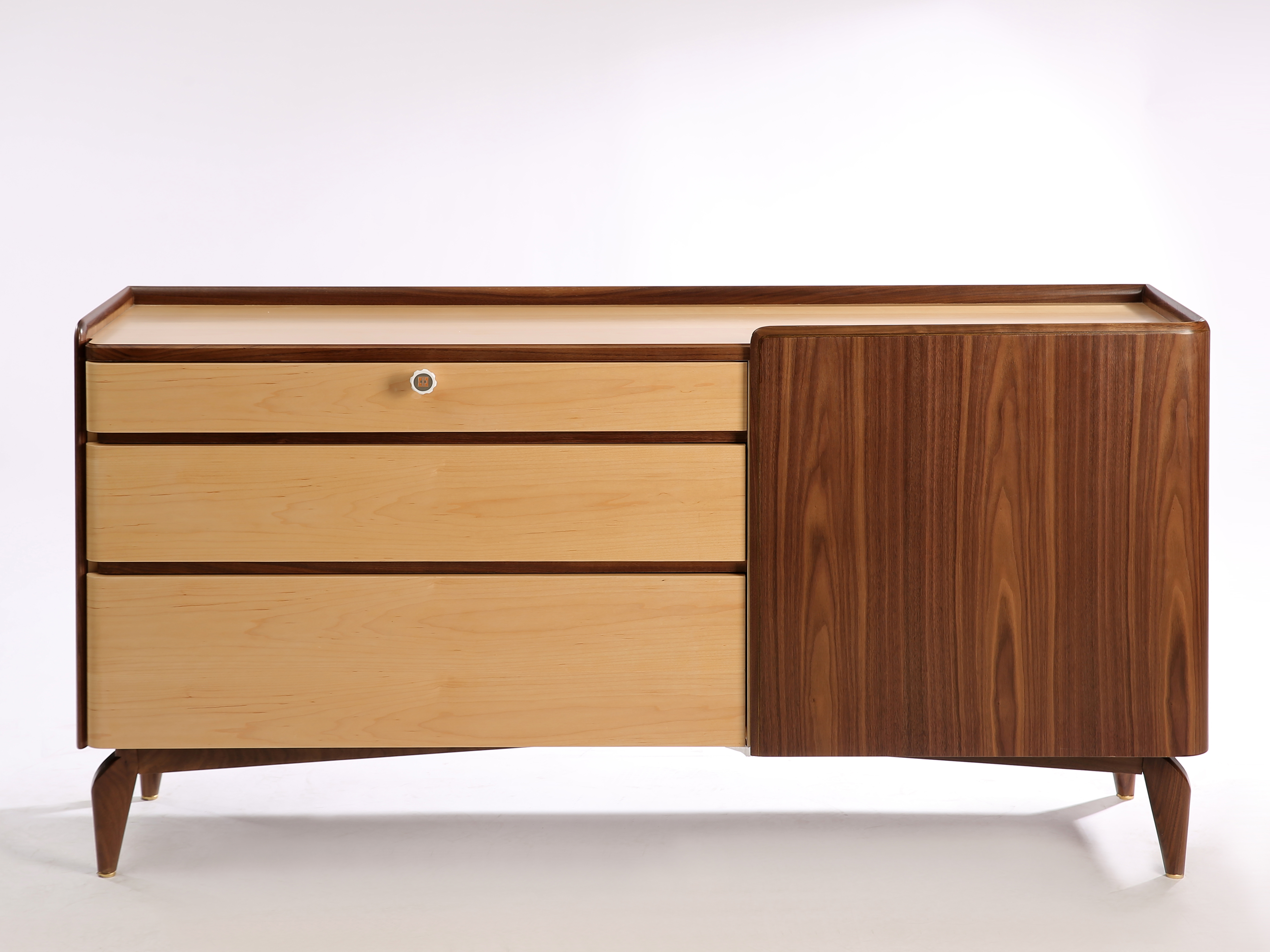 低柜造型现代优雅。低柜右侧门可从顶部打开,左侧有三个不同储存功能的抽屉。第一个抽屉可以放置珠宝首饰和珍贵物品,这层抽屉具有磁感应安全锁功能,具有防盗和防儿童攀爬倾倒功能,另外两个抽屉更大更深,为卧室提供更多的储存空间。