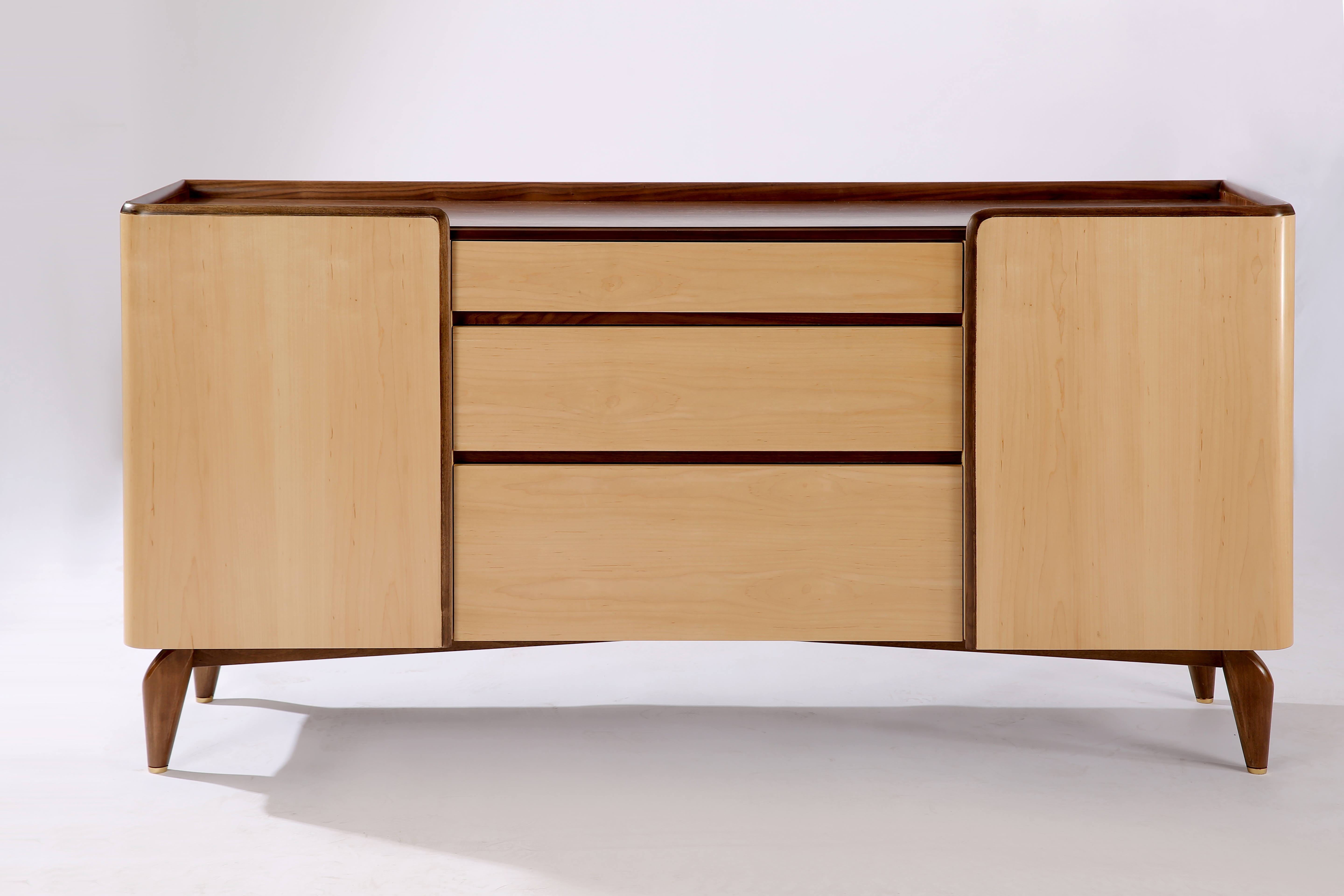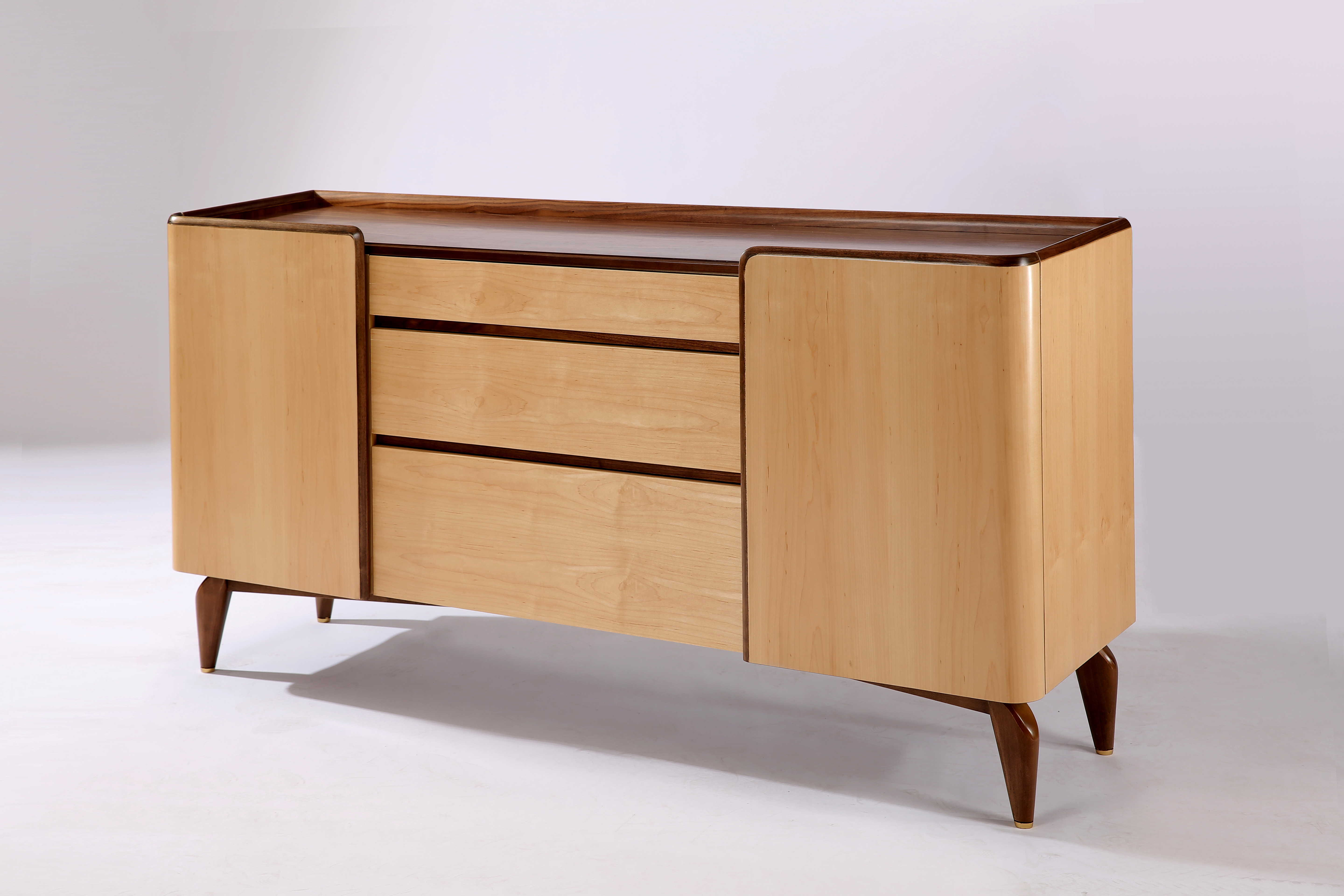 餐边柜提供了一个非常实用的存储空间,在最上面的抽屉里有科学划分的格子,可以整齐摆放各种规格用餐银器。整个柜身采用枫木饰面,辅以黑胡桃点缀,展示其现代优雅的气质。