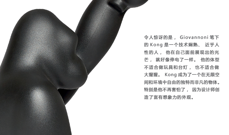 令人惊讶的是,Giovannoni笔下的Kong(金刚)是一个技术娴熟、近乎人性的人,他在自己面前展现出的光芒,就好像停电了一样。他的体型不适合做玩具和台灯,也不适合做大猩猩。金刚成为了一个在无限空间和环境中自由的独特而非凡的物体。特别是他不再害怕了,因为华体会体育官方在线官网创造了富有想象力的外观。