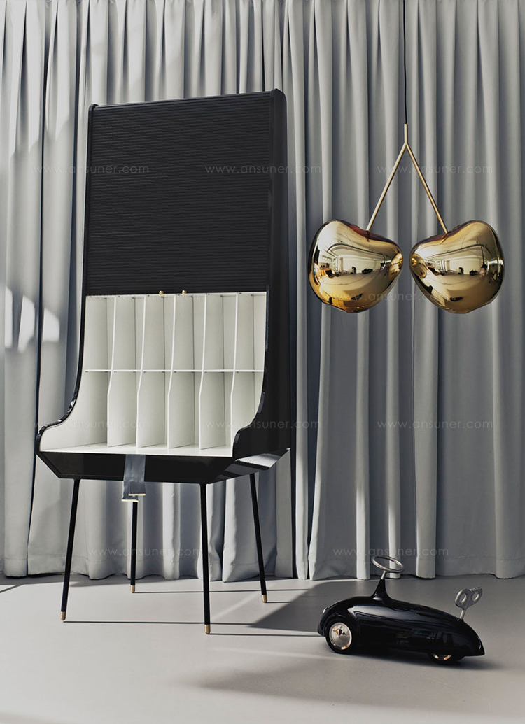 吊灯悬挂在天花板上,闪烁着欲望的光芒:它迷人而丰满的形状,能够反映出华丽的外表和金色的外表,暗示着一种从树上摘水果的本能。