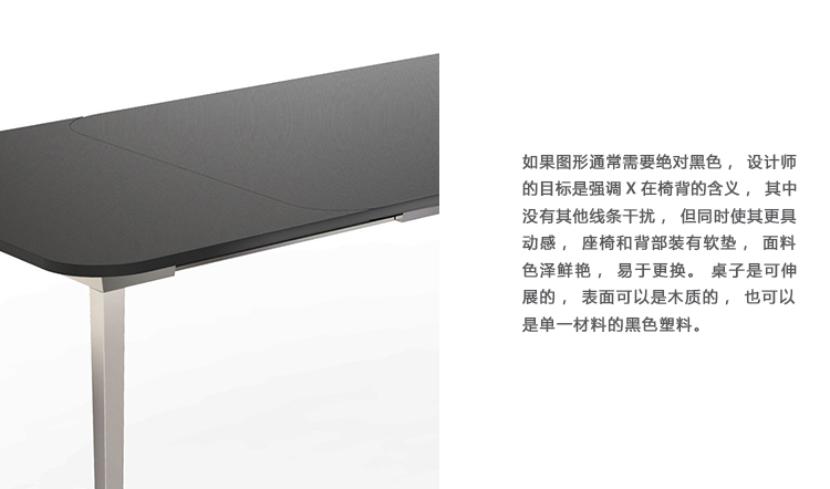 如果图形通常需要绝对黑色,华体会体育官方在线官网的目标是强调X在椅背的含义,其中没有其他线条干扰,但同时使其更具动感,座椅和背部装有软垫,面料色泽鲜艳,易于更换。 桌子是可伸展的,表面可以是木质的,也可以是单一材料的黑色塑料。