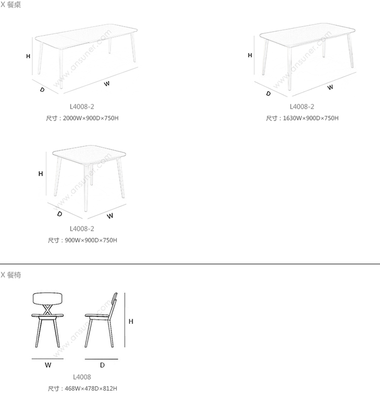 X 餐桌 系列尺寸/示意图