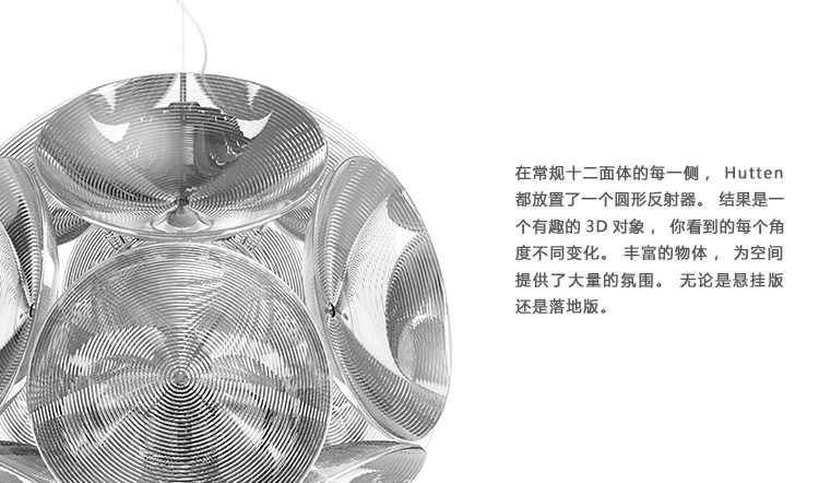 在常规十二面体的每一侧,Hutten都放置了一个圆形反射器。 结果是一个有趣的3D对象,你看到的每个角度不同变化。 丰富的物体,为空间提供了大量的氛围。 无论是悬挂版还是落地版。
