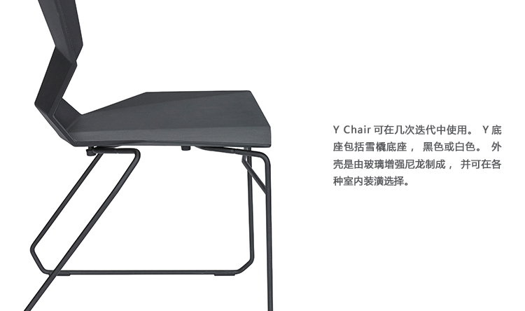 Y Chair可在几次迭代中使用。底座包括雪橇底座,黑色或白色,Y底座可在透明漆或黑色的橡木或旋转底座铝或黑色。外壳是由玻璃增强尼龙制成,并可在各种室内装潢选择。需要组装。