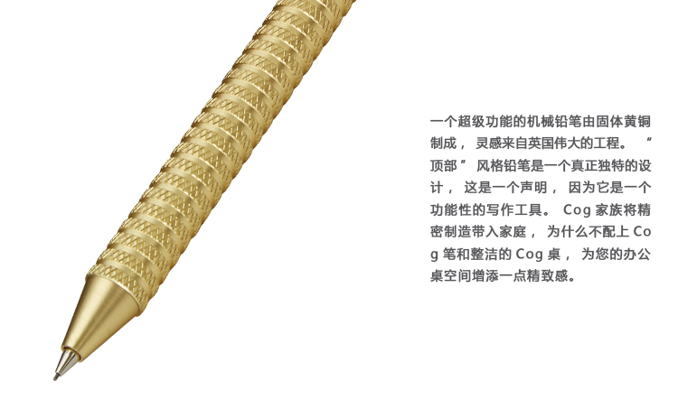 我们备受喜爱的cog家族的新成员。 这是一款超级功能的自动铅笔,灵感源自英国伟大的工程设计来自实心黄铜。 Cog系列为家庭带来精密制造,为什么不配合我们的cog Pencil和Cog Desk整理为您的桌面空间增添一丝精致感。 铅笔芯厚度:0.5mm。