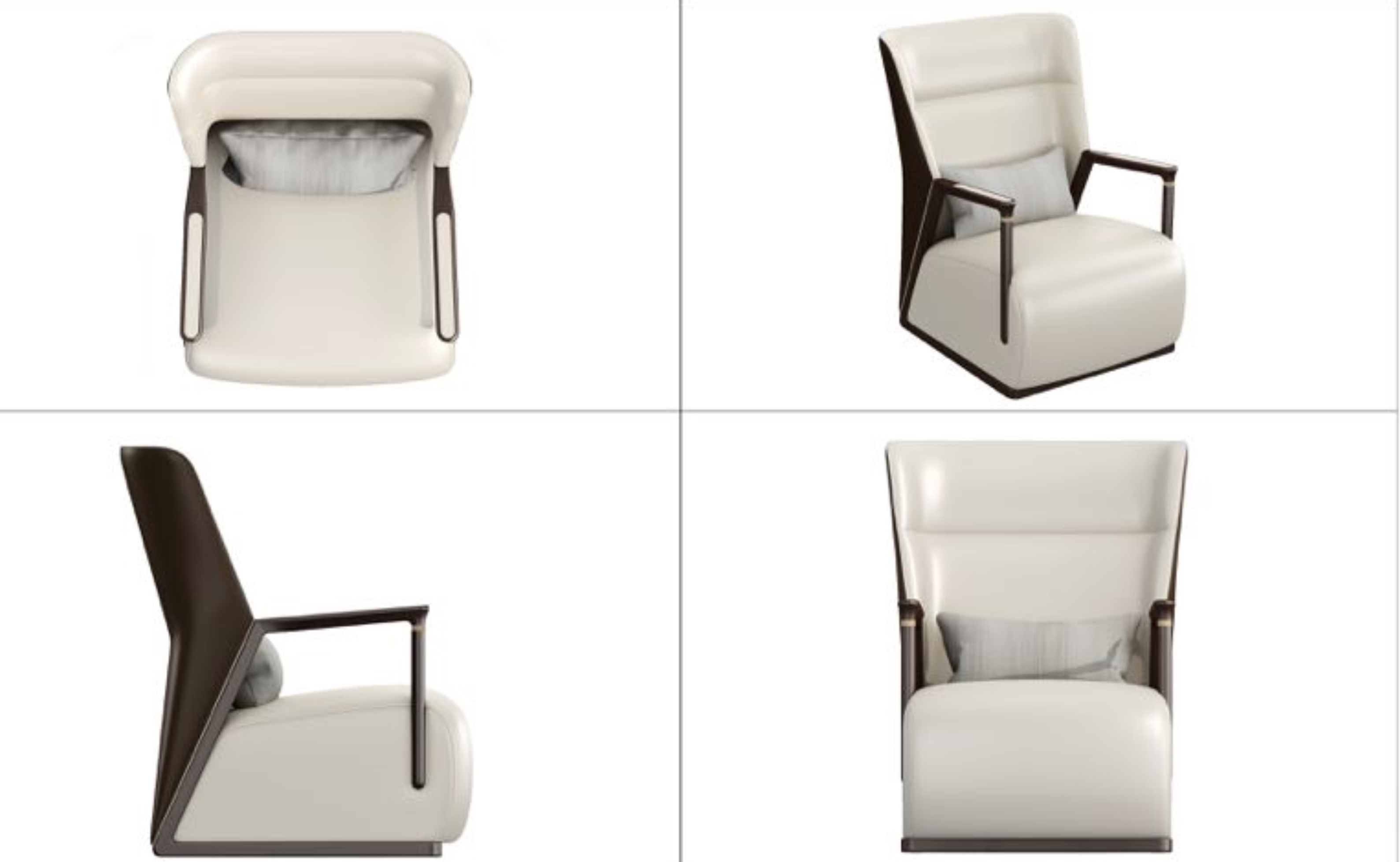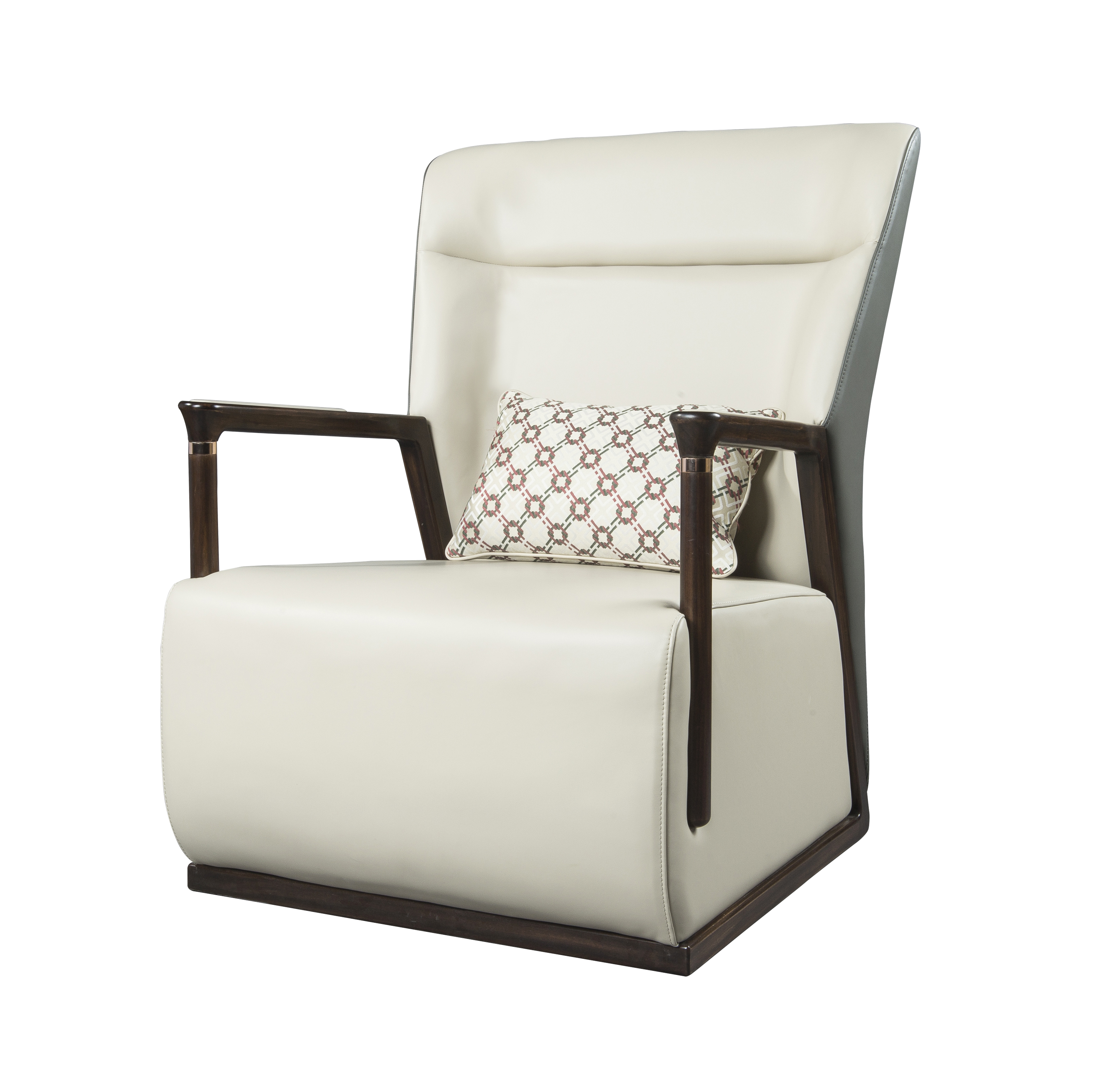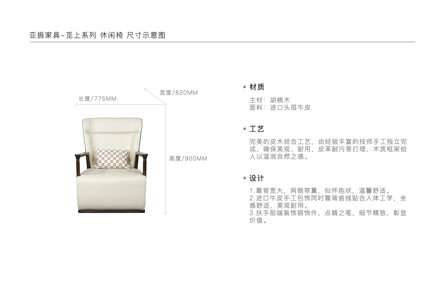 1.靠背宽大,两侧带翼,似怀抱状,温馨舒适。 2.进口牛皮手工包饰同时靠背曲线贴合人体工学,坐感舒适,美观耐用。 3.扶手前端装饰铜饰件,点睛之笔,细节精致,彰显价值。