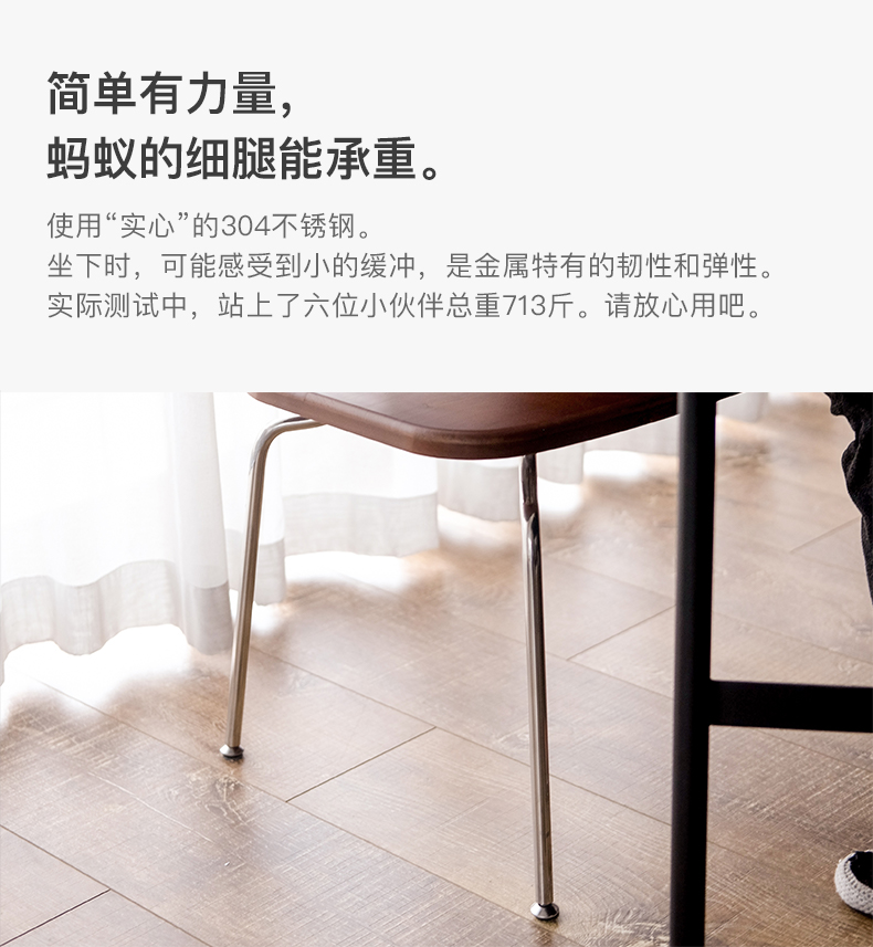 经典蚂蚁椅的华体会体育官方在线官网ARNE JACOBSEN说,美丽的线条带有微笑。我们不断调整, 直到它又舒服、又美貌。不锈钢的线条创造出神奇的光影,让眼睛随着线条流动, 宛转自然,也有视觉支点。背面同样精心设计,好看的角度一键全选。 使用实心的304不锈钢,坐下时,可能感受到小的缓冲,是金属特有的韧性和弹性。