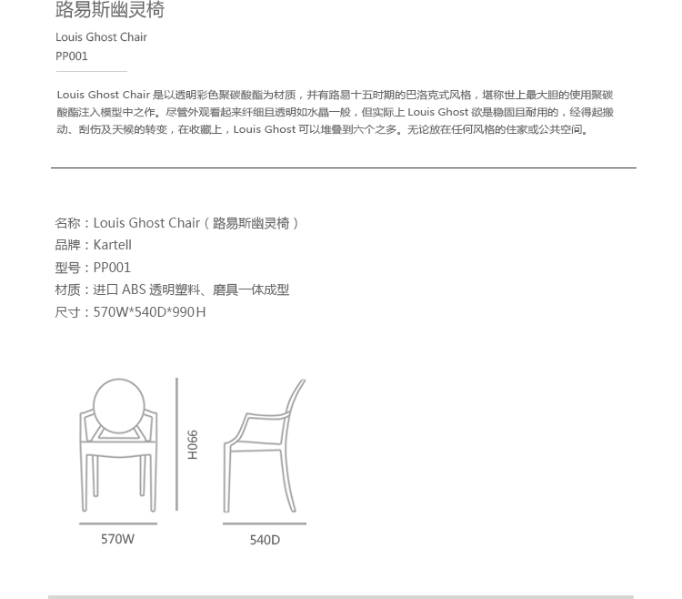 ouis Ghost 是以透明彩色的聚碳酸酯為材質,並有路易十五時期的巴洛克式風格,堪稱世上最大膽的使用聚碳酸脂注入模型中之作。儘管外觀上看起來纖細且透明如水晶一般,但實際上 Louis Ghost 卻是穩固且耐用的,經得起搬動、刮傷及天候的轉變,在收藏上,Louis Ghost 可以堆疊到六個之多。無論放在任何風格的住家或公共空間,Louis Ghost 皆能吸引眾人的目光並帶點優雅與反諷。