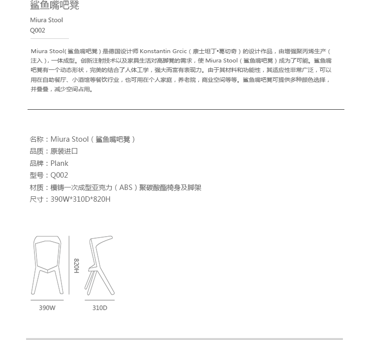 Miura Stool(鲨鱼嘴吧凳)是德国华体会体育官方在线官网Konstantin Grcic(康士坦丁·葛切奇)的设计作品,由增强聚丙烯生产(注入),一体成型。创新注射技术以及家具生活对高脚凳的需求,使Miura Stool(鲨鱼嘴吧凳)成为了可能。鲨鱼嘴吧凳有一个动态形状,完美的结合了人体工学,强大而富有表现力。由于其材料和功能性,其适用性非常广泛,可以用在自助餐厅、小酒馆等餐饮行业,也可用在个人家庭,养老院,商业空间等等。鲨鱼嘴吧凳可提供多种颜色选择,并叠叠,减少空间占用。