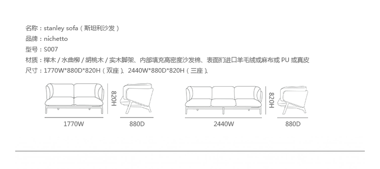 Stanley沙发系列是意大利著名华体会体育官方在线官网Luca Nichetto 为伦敦家具厂商 De La Espada打造的。沙发椅则展示了 De La Espada 精湛的制木工艺,从羊毛椅面与扶手连接处的细节就可看出。实木脚架精妙地固定着坐垫和靠垫,并巧妙的隐藏在衬垫里,外露的脚架同时展示了高超技艺和木材的优质。制作采用榉木/水曲柳/胡桃木/实木脚架、内部填充高密度沙发棉、表面扪进口羊毛绒或麻布或PU或真皮。