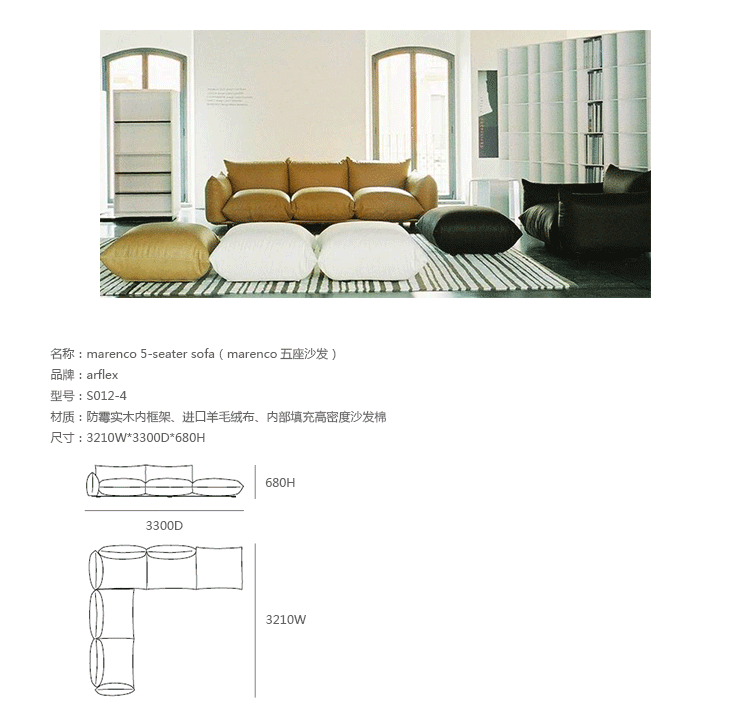 "marenco sofa系列沙发由华体会体育官方在线官网Mario Marenco在1971年所推出,Arflex公司出品,有单座,双座,三座,和五座组合形式。这款经典的沙发线条经典,舒适度饱满,成为摩登家居用品经典作之一。外型以简约细腻的北欧设计为方向,轻盈的金属脚架与薄型扶手,在厚薄粗细之间,视觉比例的层迭丰富,融合义式沙发中柔软舒适的元素,靠垫内衬高密度泡棉,兼具支撑性与松软度。这套沙发采用革命性的方式组合,垫子及扶手都是独立的部分。枕头是挤压钢管的金属框架,提供了刚性和耐用性。胶合板基地加上纤维覆盖。制作采用防霉实木内框架、进口羊毛绒布、内部填充高密度沙发棉,保证了高品质的奢华与舒适。