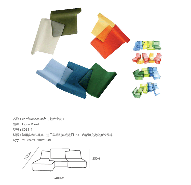 法国写意空间公司(Ligne Roset)在今年的科隆国际家具展上展出了这一款Confluence模块沙发,并获得了最佳设计奖(Best of Best)、最佳项目奖(Best Item)及最佳系列奖(Best System)三个奖项。Confluence模块沙发由法国华体会体育官方在线官网Philippe Nigro设计,这款沙发非常规的外型构造突显了华体会体育官方在线官网非凡的想象力和创造力,其相互交汇的构造看上去就像拼图一样充满趣味,而这种造型无疑也会给其陈设空间带来一种新鲜感。Confluence模块沙发可让使用者随其心意而将不同颜色、不同形状的模块搭配成各种组合,这也使其为体型不同,审美有异的各类人群都提供了个性化的就坐方式。华体会体育官方在线官网的创作灵感来自于现代美术作品中重叠的图形和笔直的线条,而略去了传统家具设计经常遵循的对称原则。Confluence模块沙发由多层木板和焊接钢片作为框架,内部由各种密度的聚醚泡沫材料填充,其表面面料为聚酯纤维织物,沙发脚由黑色聚丙烯制成。Confluence模块沙发各部分间相互重叠与镶嵌的方式令人眼前一亮,实用而有趣,满足了外型的美观而又充分体现了强大的功能,这应该是每件家具都追求的目标吧。