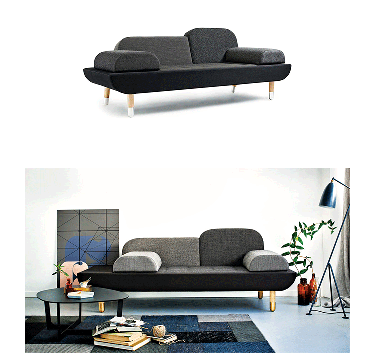 Toward is a comfortable sofa that allows the user to lounge in multiple ways.By merging the normal use of an armchair,a chaise longue and a tete-a-tete,the design emerged.Toward is a base with a mattress and two back rests in different sizes.The two loose and interchangeable cushions further opens up for a versatile appearance and function.To achieve a unique product with high aesthetics,a lot of consideration went into combining the color nuances and texture of the textiles chosen.The sofa comes in five color combinations:light gray,dark gray and brown,pink and dark blue shades with shoes in solid brass or aluminum.Every color combination consists of 6 different color nuances and textures from Kvadrat Textiles.