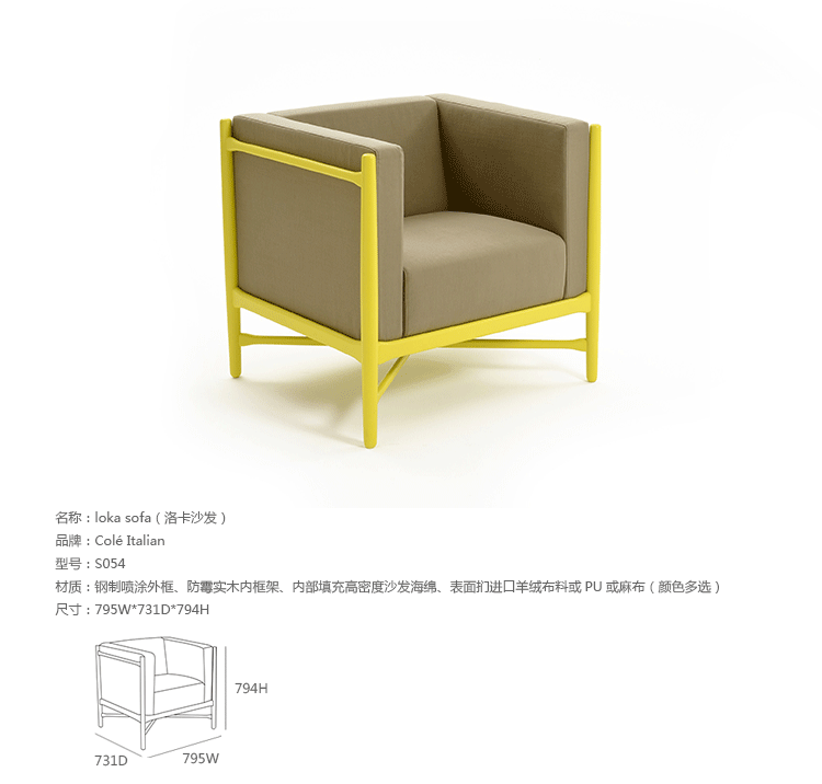 Loka Sofa(洛卡沙发)是华体会体育官方在线官网Catharina Lorenz和Steffen Kaz的作品,优雅、时尚,舒适,立体,具有个性。加高的脚型拉大脚架的比例,刻意凸显其优美的线条,是款用来休憩放松的沙发首选,现代感兼具舒适功能,无论是居家或公共空间都非常适合。制作采用钢制喷涂外框、防霉实木内框架、内部填充高密度沙发海绵、表面扪进口羊绒布料或PU或麻布(颜色多选)。
