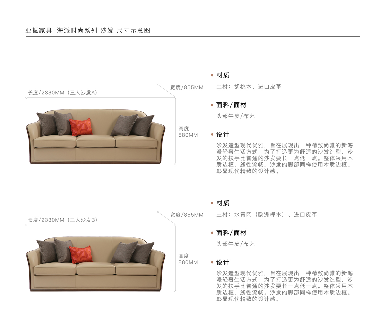 沙发造型现代优雅,旨在展现出一种精致尚雅的新海派轻奢生活方式。为了打造更为舒适的沙发造型,沙发的扶手比普通的沙发要长一点低一点。整体采用木质边框,线性流畅。沙发的脚部同样使用木质边框。彰显现代精致的设计感。