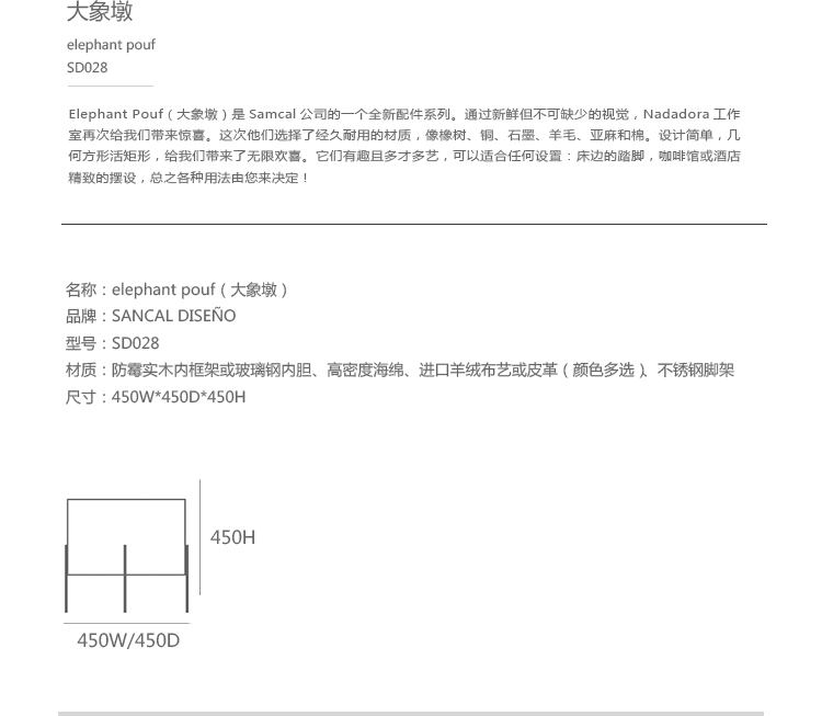 Elephant Pouf(大象墩)是Sancal公司的一个全新配件系列。通过新鲜但不可缺少的视觉,Nadadora工作室再次给我们带来惊喜。 这次他们选择了经久耐用的材质,像橡树、铜、石墨、羊毛、亚麻和棉。设计简单,几何方形或矩形,给我们带来了无限欢喜。它们有趣且多才多艺,可以适合任何设置︰床边的踏脚,咖啡馆或酒店精致的摆设,总之各种用法由您来决定!