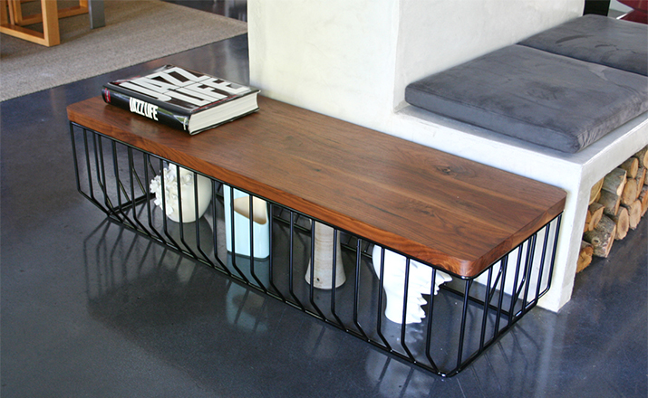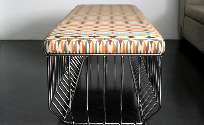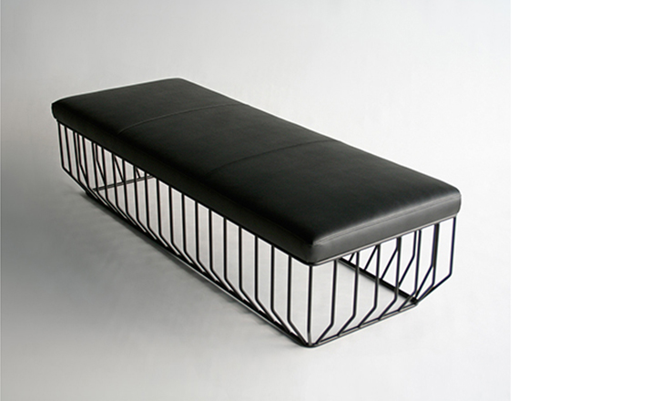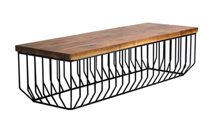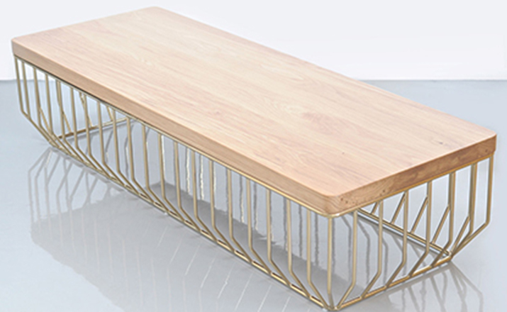 "Blending sloping angles and taut lengths of bent metal are a modern interpretation of the wiry idea initially conceived by Warren Platner.The series is made up of a suite of tables,side tables and benches and fitted with luxurious solid wood or upholstered tops."