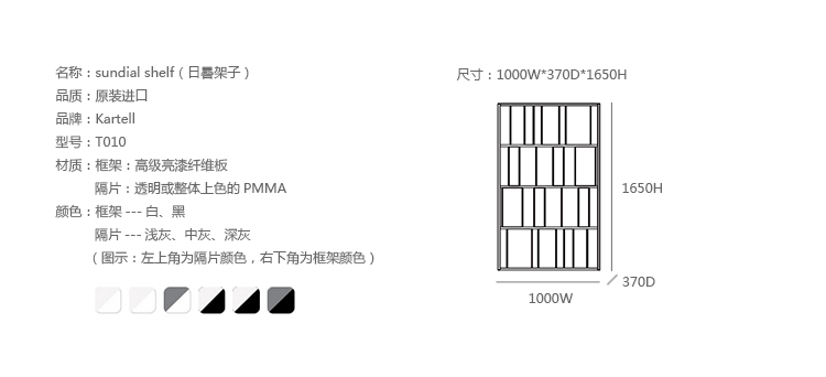 Sundial Shelf(日晷架子)是由日本 Nendo工作室设计的,灵感来自日式组合餐盘,简约的亮白、亮黑设计,造型典雅,如同餐盘的组合造型,放大于餐桌和收纳空间的具体实践。 桌面材质为高强度聚酯合成塑材,支架部份则为金属;让您对于收纳架的印象焕然一新,有滚轮版、固定版两种版本供您选择。Sundial Shelf(日晷架子)由四个储物架可用有着灵活,轻巧,结构紧凑,易于组装成多个模块的特点,可以靠在墙上。