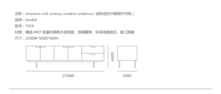 structure mid century modern credenza(结构世纪中期现代书柜)是Kardiel公司制作的经典实木家具。设计灵感来着 Cees Braakman于1958年的原创设计,其有着青铜色的脚架,镶嵌着把手。随着新技术和设计材料的使用,结构以焕然一新的样式出现,框架手工进行了精心雕琢,浑然天成又不失艺术性。制作采用精选MDF板基材胡桃木皮贴面、钢制脚架、环保油漆喷涂、做工精湛。