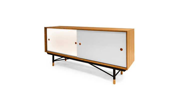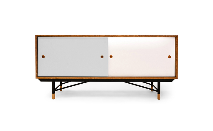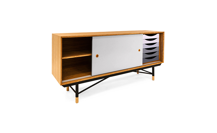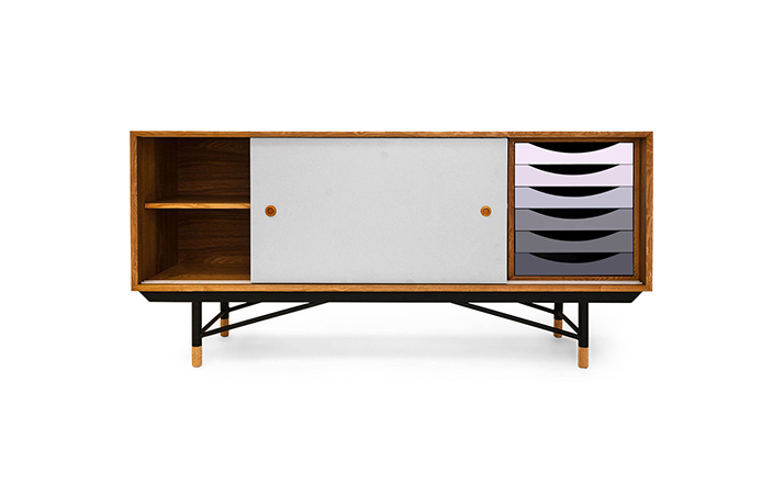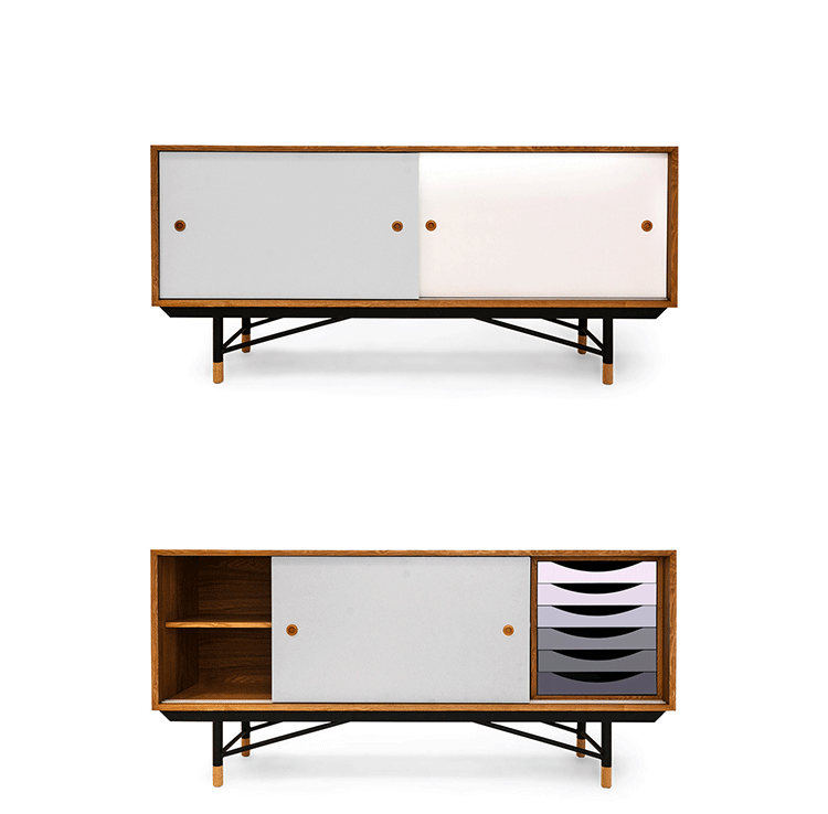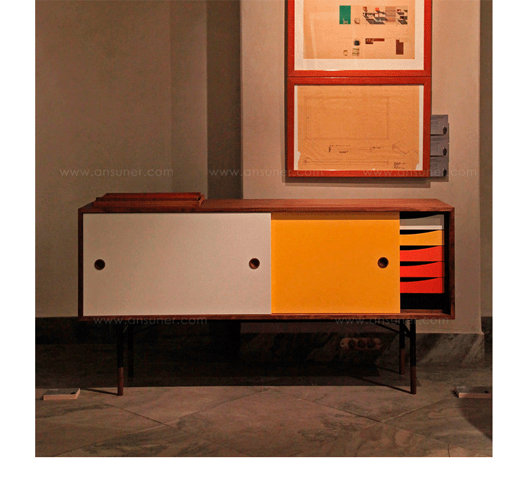 color theory sideboard(色彩理论餐边柜)是华体会体育官方在线官网Juhl Finn设计的,Kardiel公司制作的经典实木家具,1940年,他设计的第一张座椅、也是最经典的作品——《鹈鹕椅》(Pelican Chair),目前为纽约现代艺术博物馆 MOMA 所珍藏。彩色的滑动门与托盘餐具柜是1955年由Juhl Finn为BOVIRKE设计的。)是Kardiel公司制作的经典实木家具。复古但永不过时的木炭是和橙色,结合美国核桃开创了20中世纪六十年代中现代主义的时代。在现代主义的存储家具上, Finn Juhl和 Arne Vodder 最先尝试胶木和天然木的组合运用。这是大胆的创新,他们结合传统的新鲜的新兴技术与现代主义的概念。他们通过这些色彩绚烂的产品所实现的是令人印象深刻的比例的平衡。制作采用精选MDF板基材胡桃木皮或水曲柳贴面、五金脚架、环保油漆喷涂、做工精湛。颜色元素的使用反映了他迷恋歌德的著名彩色圈,颜色处于和谐的凝聚力。