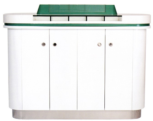 台面为白色人造石,白色烤漆围板,中岛及中间槽内为农行绿色专色亚克力,拉丝不锈钢踢脚,一边四开门,带层板。含钢化玻璃票据盒。