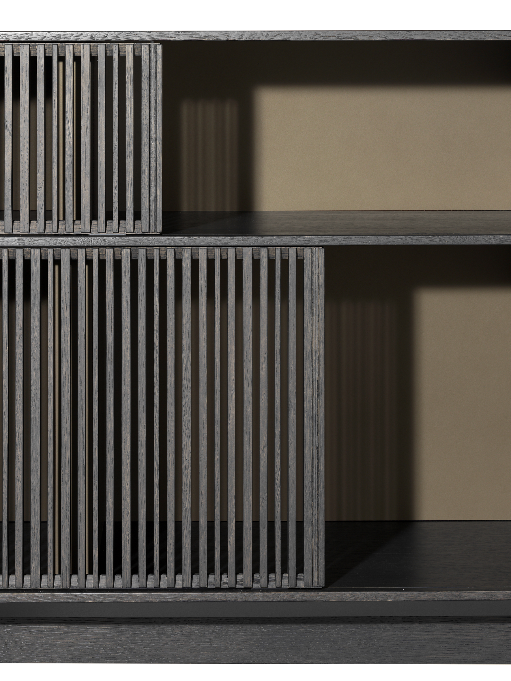 一系列的薄垂直木制棒光网格形式,无形的水平轨道上运行从上到下。 每个网格可以根据需要创建不同的序列。 固体和空洞的分数波动,光与影。 一个好玩的游戏,允许的内容、书籍和对象,没有完全揭示。 最先进的技术结合传统材料,木材和马鞍皮革,形成一个固体和简约的结构。