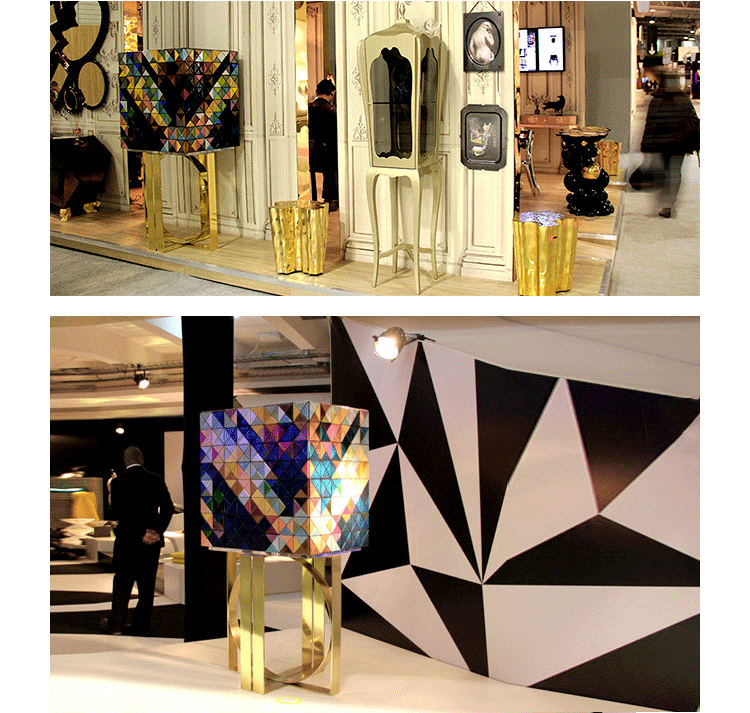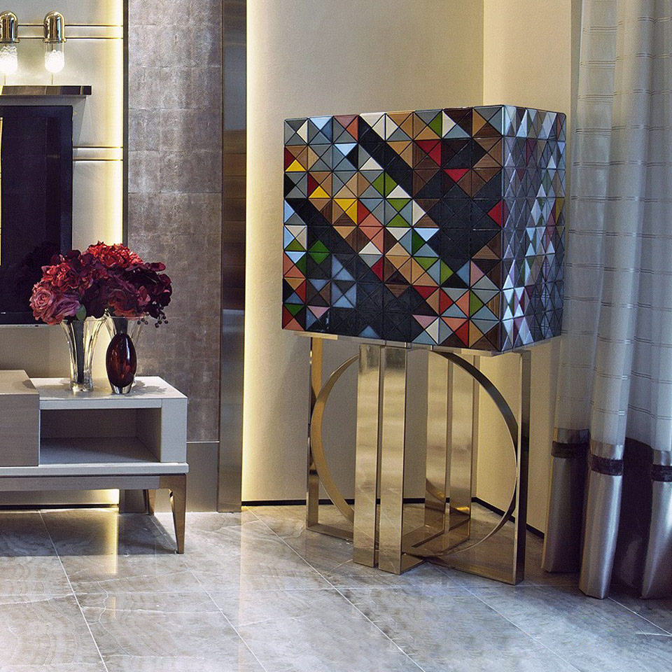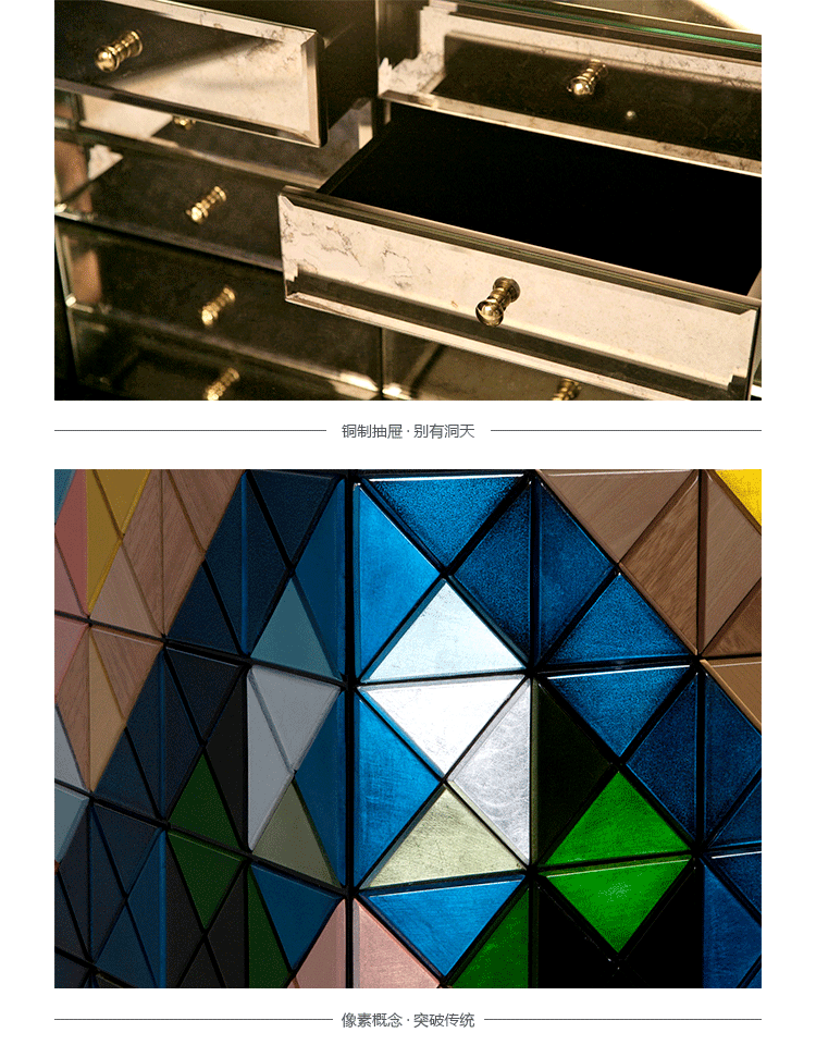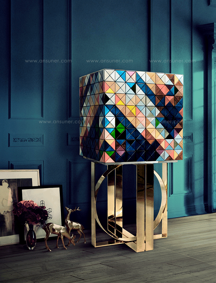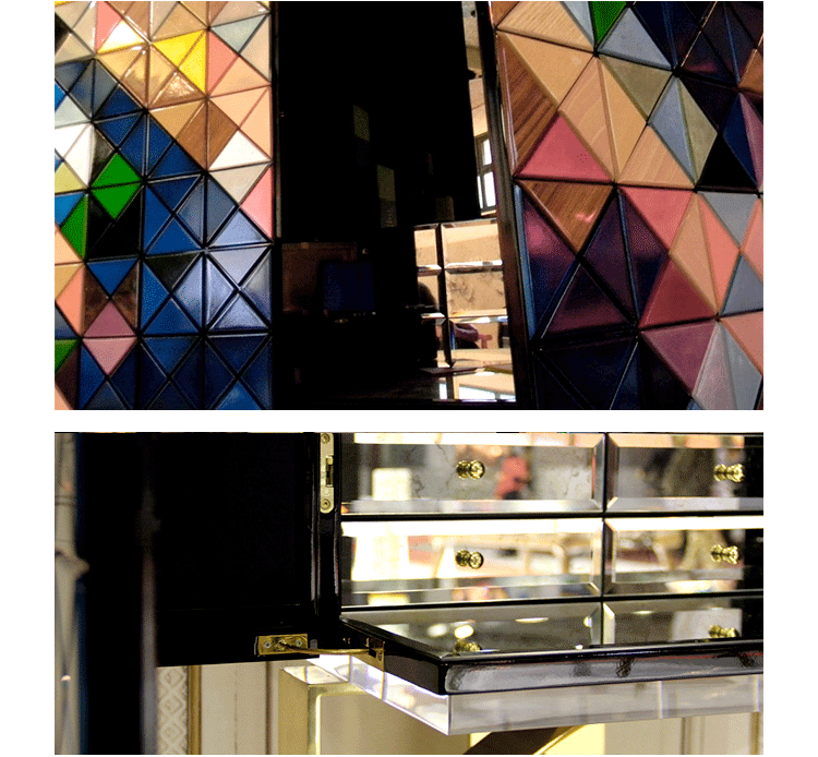1088木森林的多样性和完成三角形:银叶,金箔,彩色涂料,十个不同类型的木材叶(乌木单板、非洲胡桃木单板、zebrano单板,杨树单板,黑黄檀。 室内:两扇门在里面完成钻石绗缝蓝色丝绸织物开放九个抽屉用金旋钮和内阁空间所有年龄在镜子里完成。 基础:抛光黄铜