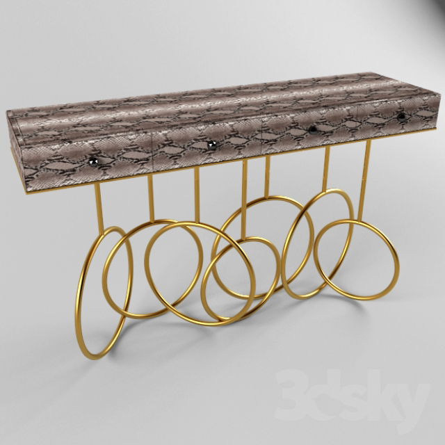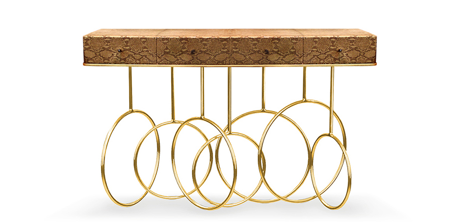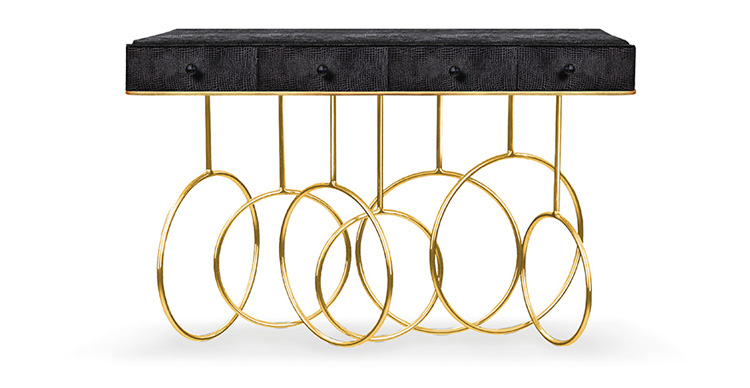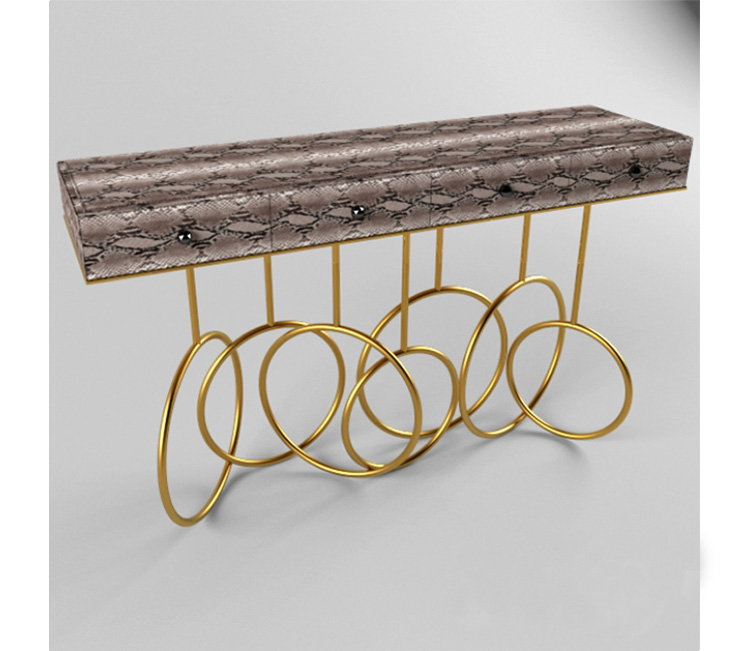 Burlesque console的设计灵感源于通过重新审视法国歌舞表演令人眼花缭乱的世界。在这四个抽屉里的每一个抽屉都是由一个散发异国风情的蛇皮扪面和黑色的水晶状拉手组成,底架由仿佛旋转着的金色环状不锈钢构成脚架,散发出一股活跃的女主角的神秘特质。
