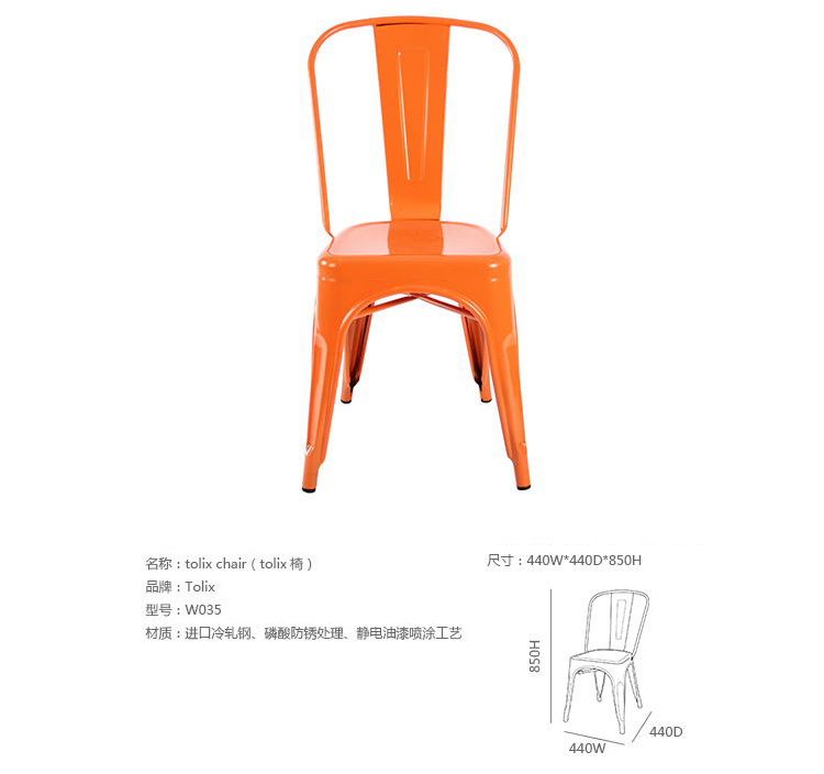 tolix chair(tolix椅)一把有味道、有态度的椅子,据说它最开始被使用在一艘战舰的天气预报房间里,故事的真实性与否不得而知,但是不影响其成为享誉世界的著名设计家具,1934年由Xavier Pauchard设计,早期是作为户外用家具设计,力图展现法式慵懒而闲适的气质,经年而来被全世界时尚华体会体育官方在线官网所宠爱,从室外扩展到家居、商业、展示等多个用途,而此椅也不负众望在各类空间中均有上佳表现,特别是近年来与混搭、乡村、美式、怀旧、北欧简约、中式等主要装修风格搭配,都呈现出独特的韵味,也被时尚界赞为“百搭第一”椅,可以用在酒吧,餐馆,咖啡馆等等地方,之后通过改进,设计出有扶手版本的tolix armchair(tolix扶手椅),高背版本的tolix high back bar stool(tolix高背吧凳),宽背版本的tolix wide back bar stool(tolix宽背吧凳),及tolix bar stool(tolix吧凳)和tolix mini stool(tolix迷你凳)。制作采用进口冷轧钢、磷酸防锈处理、静电油漆喷涂工艺、坐面为木板或PU海绵坐垫,颜色可选。