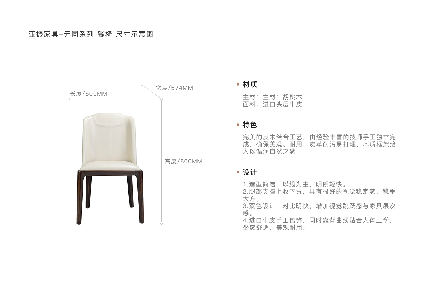 1.造型简洁,以线为主,明朗轻快。 2.腿部支撑上收下分,具有很好的视觉稳定感,稳重大方。 3.双色设计,对比明快,增加视觉跳跃感与家具层次感。 4.进口牛皮手工包饰,同时靠背曲线贴合人体工学,坐感舒适,美观耐用。