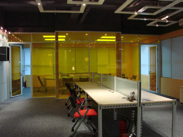 | 材料说明:炭黑色铝框、6mm钢化灰玻、9mm木饰面板设计说明:大跨度的高隔墙设计,配以深色线条,暖色搭配,使得紧张的工作环境平添了一笔温馨色彩。中间钢化灰玻的运用,让室内空间能有效的和外界沟通,突出了实用功能,真正让人体验到工作的乐趣! |