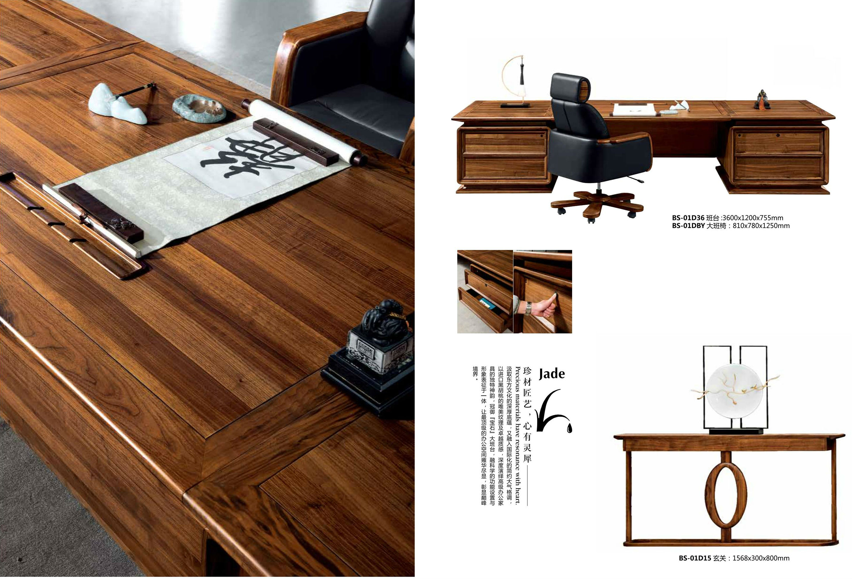 汲取东方文化的深厚底蕴“又融入国际化的简约大气格调,以进口黑胡桃的唯美纹理及卓越质感 深度演绎高级办公家具的独特神韵“冠御一宝石一大班台 融科学的功能设置与境界·形象表征于一体 让最顶级的办公空间雍华尽显“彰显巅峰。 【匠心御木,文化入魂】 艺之道 贵在精贵在纯“但 在这讲求效率“追求速度的工业时代“仿佛整个世界都变得浮躁“而冠御的品牌理念刚好与之相反“我们的工匠大师坚持每一个细节“每一道工艺“都要绝对的专注 用自己的心去感受 用自己的手去苛刻所有的细腻和点滴“在冠御看来“作品就是人品这个时代最需要的 就是这种能够沉住性子“认真做好每一件作品的工匠精神。 【冠御四海,达雅天下】 不甘平凡“向着心中的方向勇敢前行“山重水复却愈见光明 触及巅峰又渴望更高的远峰 此为成功者之境界“亦为冠御办公家具品牌之道“冠御办公家具精选珍材“以名师匠作“缔造办公家具中的世界名作为不甘平凡者提供一方驰骋事业与艺术文化的灵性空间 运筹冠绝四海的雄心“统御旷达天下的才情 在不动声色间品位自显“触目可及处气象万干。 【神韵东方,国际奢华】 东方“以一种神秘与羞涩的形象吸引世人向往“流行也因这种保守而沉潜千年“正因为如此“切因内敛而迷人。冠御办公家具“注重从东方文化中汲取灵感“江南雅居,小桥流水 唐宋诗篇......万般随手可得的东方造型元素与文化印象“在国际化轻奢艺术主义启迪“洗炼下“成为办公家具设计上的闪光点“或隐“或现·不论意象“形态,俯拾皆美。 【儒商达士,韬略文武】 位极人生巅峰 静享成功荣耀 曾经纵横四海的雄心“归结于九尺案前 纸笔 冠达天下的时世大志化作豪椅上傲然一笑“非凡与平凡的和谐“事业与内心的平稳“让巅峰人生更显从容笃实“在偶尔独处的一刻 回归自然的纯净望窗外弯月下涌起江山如画的豪迈“斗室外的心事战场上的风起云涌 谈笑间决胜千里......