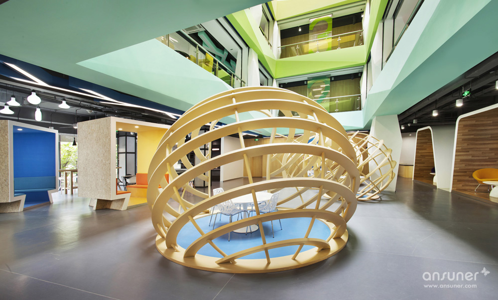 整个中庭为本案的亮点。华体会体育官方在线官网利用建筑的结构优点,并为了更好地展示出每层的特色,采用了腾讯文化中的几个主色调,不同的色调代表着每层的空间色彩效果。为了使中庭的空间感更为突出并结合设计理念中的造型元素,每层楼板外立面及柱体,都运用了立体式折线的效果。从中庭对应的一楼休闲区也设计了三组采用地球轴线组合而成的有趣的休闲讨论区,既有开放的效果,又有一定的分割隐私作用。