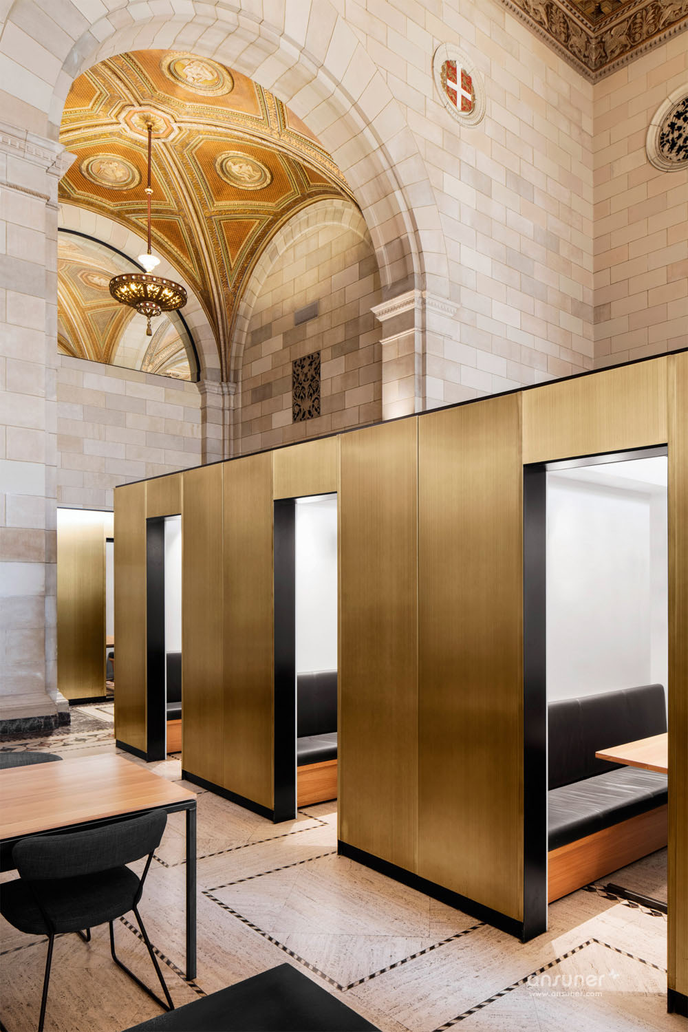 一字排开的会议室,内部隔断采用精美的拉丝镀铜钢板制作,以此与华丽的石膏天花构造形成对比和色彩上的统一。这里的会议室面向大众开放,任何人都可以预定使用。正面透明的玻璃设计可以随时观望会议室的使用状况。