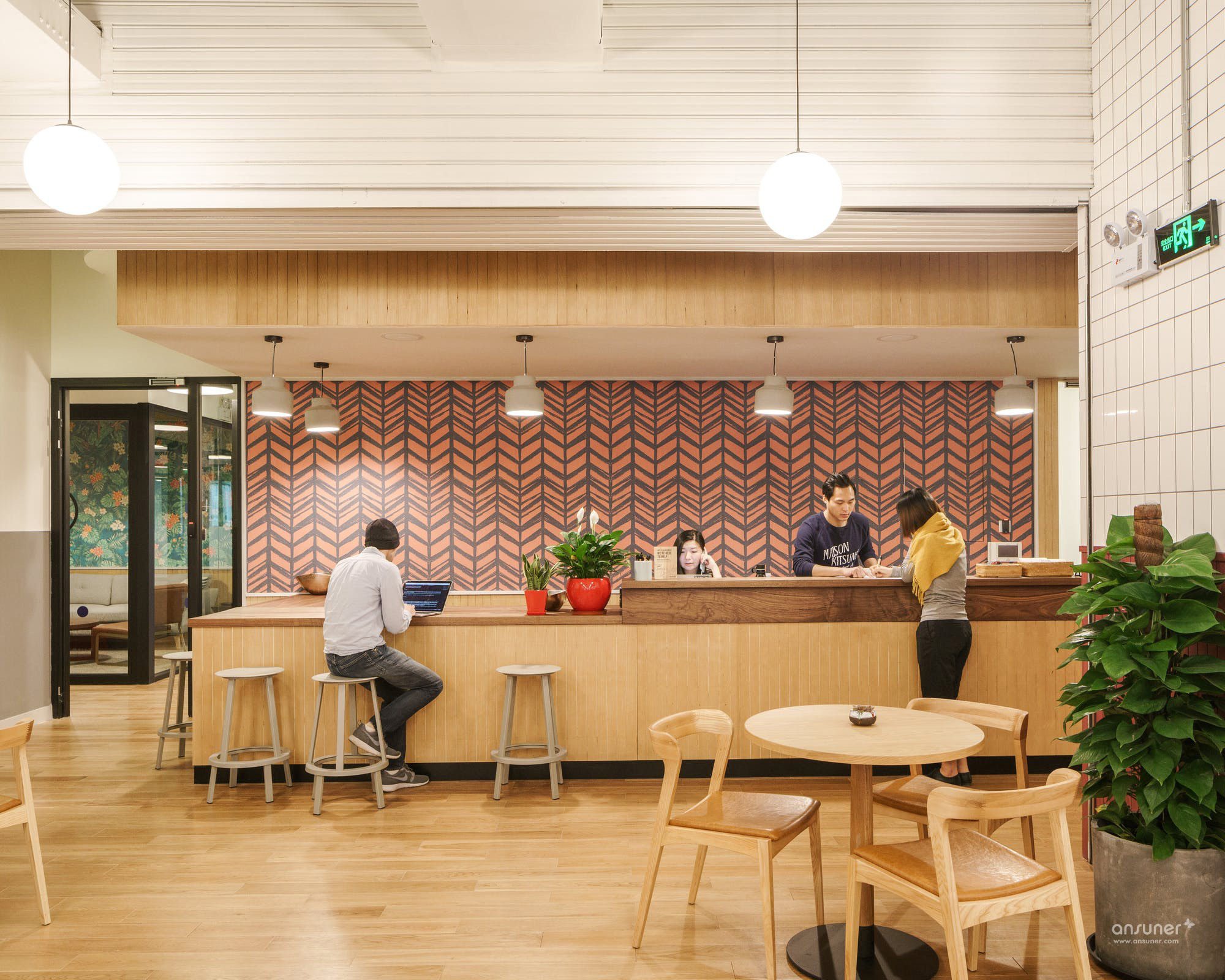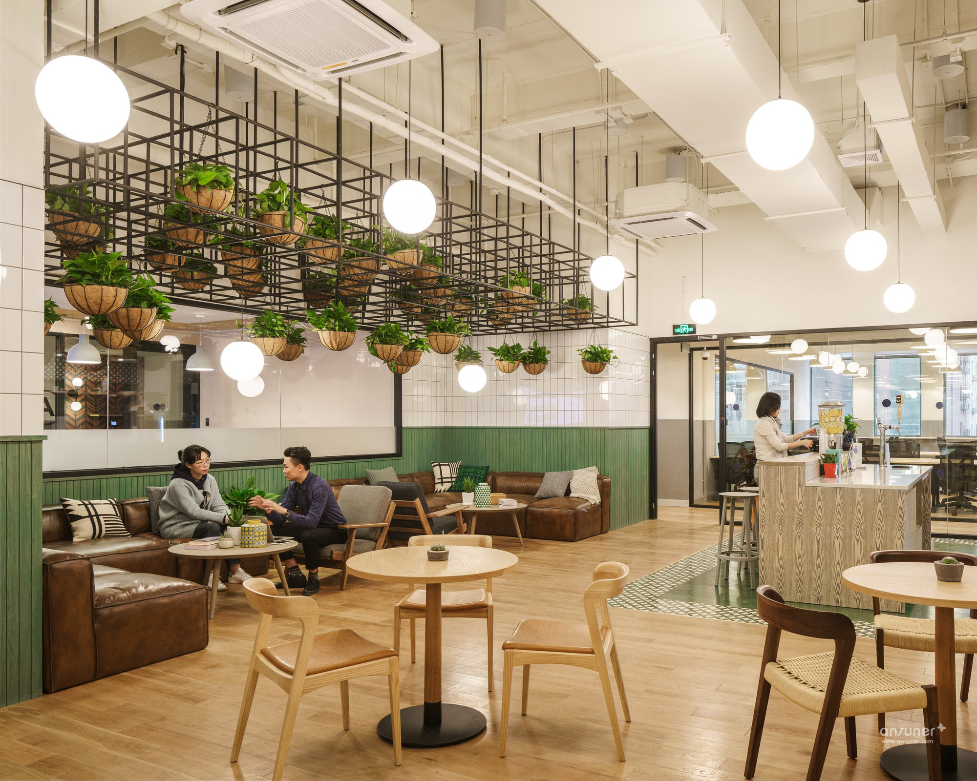 三楼公共区域则为会员提供了宽大舒适的皮质沙发,同时华体会体育官方在线官网再次在公共区域使用了大面积黑色铁质框架和绿色植物,而三楼茶水间的地面则铺设了绿色的瓷砖。