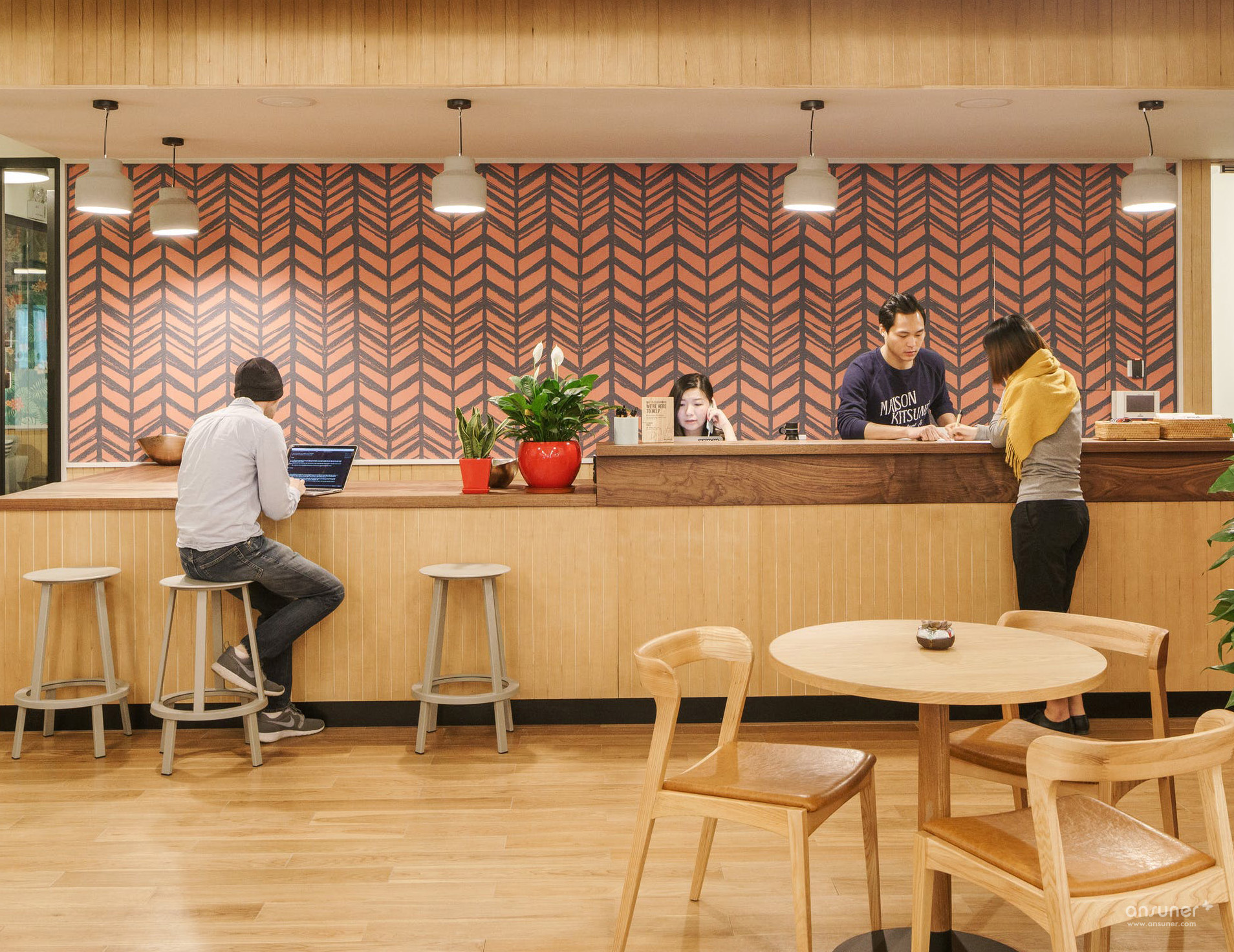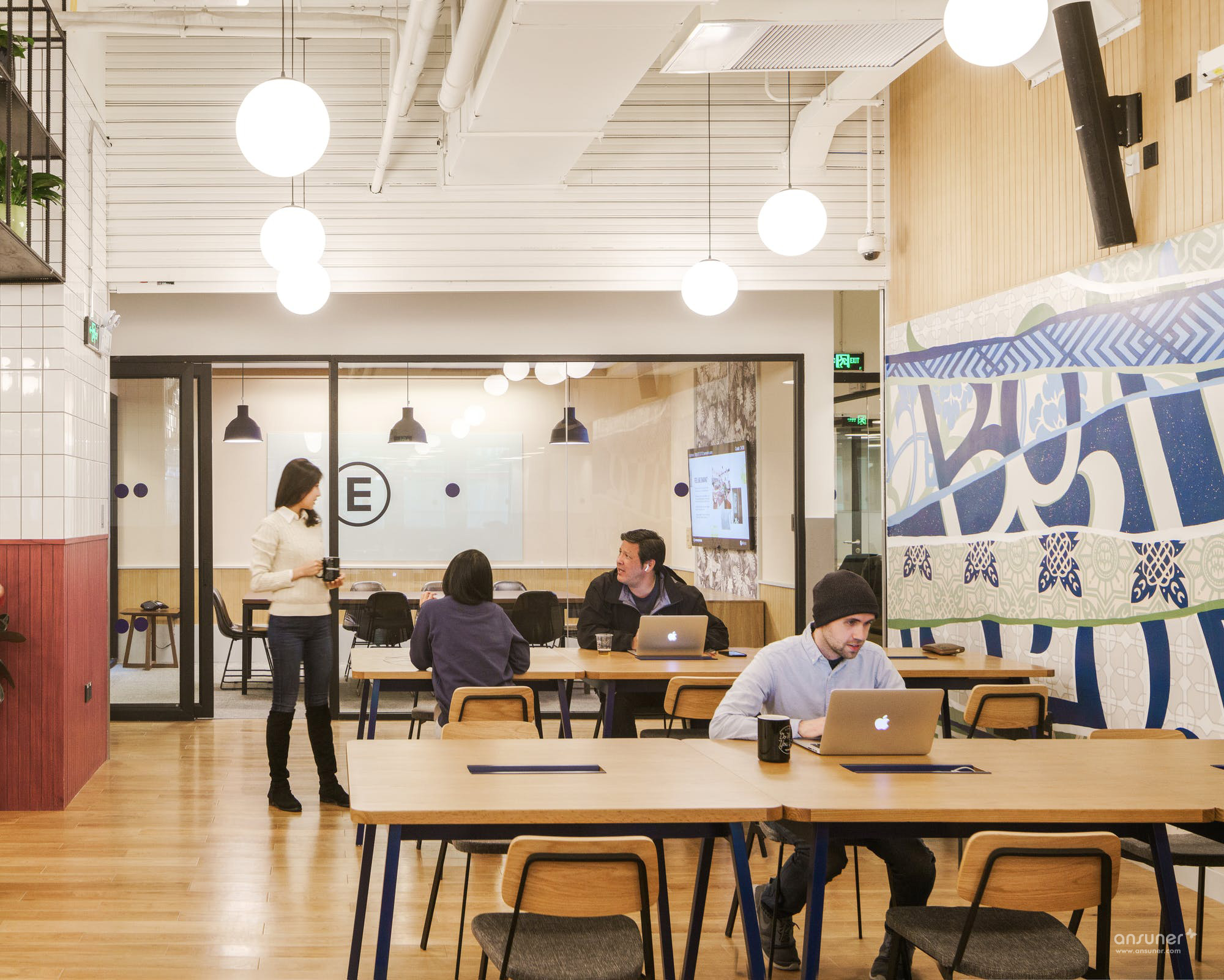 公共空间左侧是一幅本土画工手绘壁画,色彩明快充满张力,不规则变形图案则来自中国新疆地区及古丝绸之路中常见的植物花纹装饰。古丝绸之路跨越了东西方及欧亚大陆文明,衍生出了明显带有不同地域文明的装饰图案,都被华体会体育官方在线官网通过不同层次的用色,融合在这一壁画中。蓝色及灰色变形字母,则是WeWork所倡导的办公文化:Better Together (一起创造),而在公共空间右边的社区接待处,更是有红色霓虹灯的Better Together字样遥相呼应。