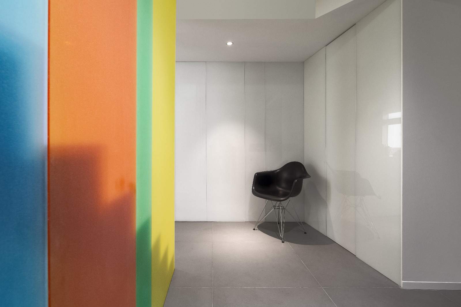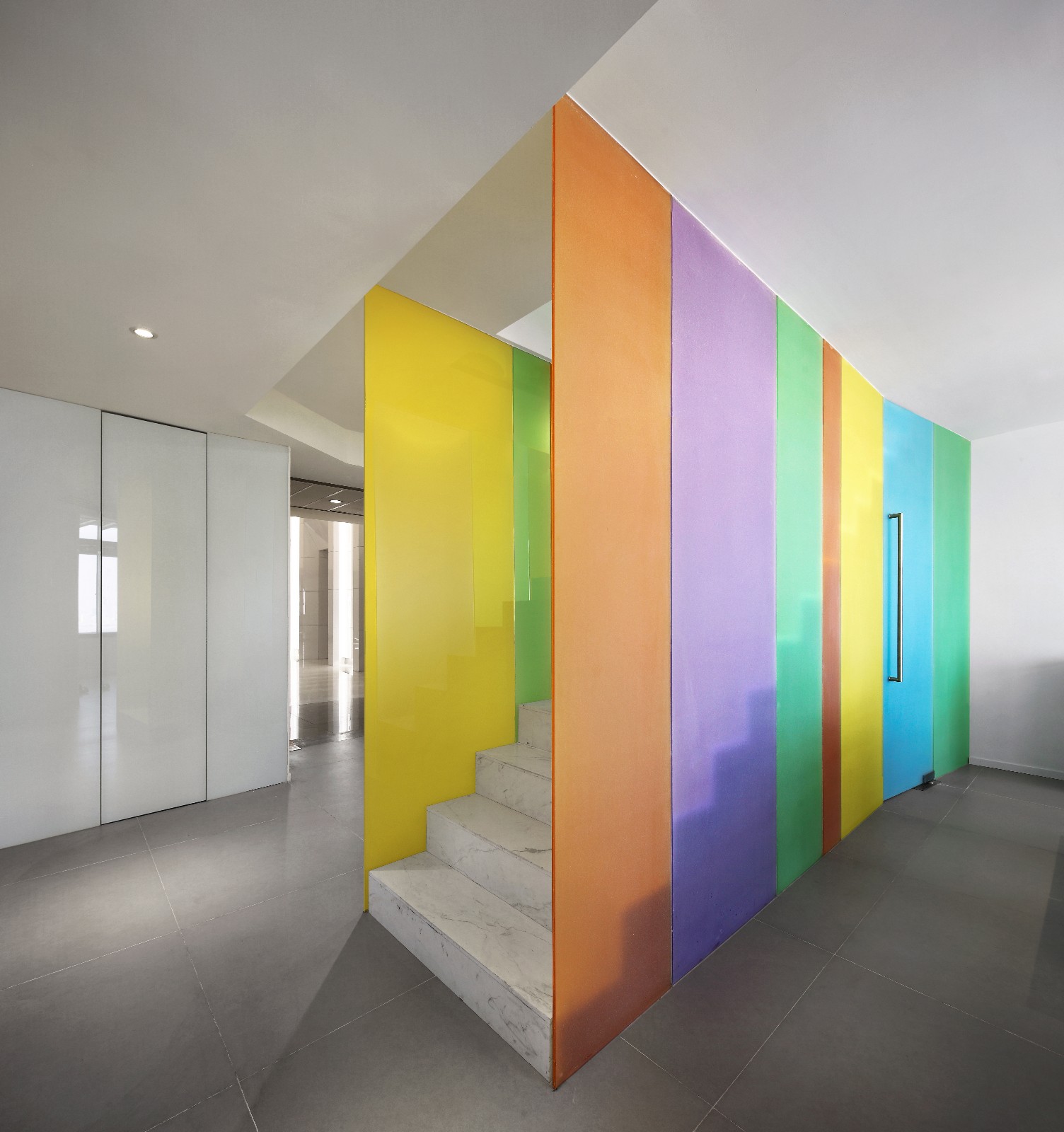 继续前进,你会发现一道纯白色大理石架空楼梯嵌于两道“彩虹”之间,一字排开的的楼梯和顶天立地的玻璃形成天然屏风,前台区和员工区自然分割互不干扰。行走上面,似有如梦似幻的感觉,这彩色一直延伸至二楼,并围绕楼梯洞口完成交圈。