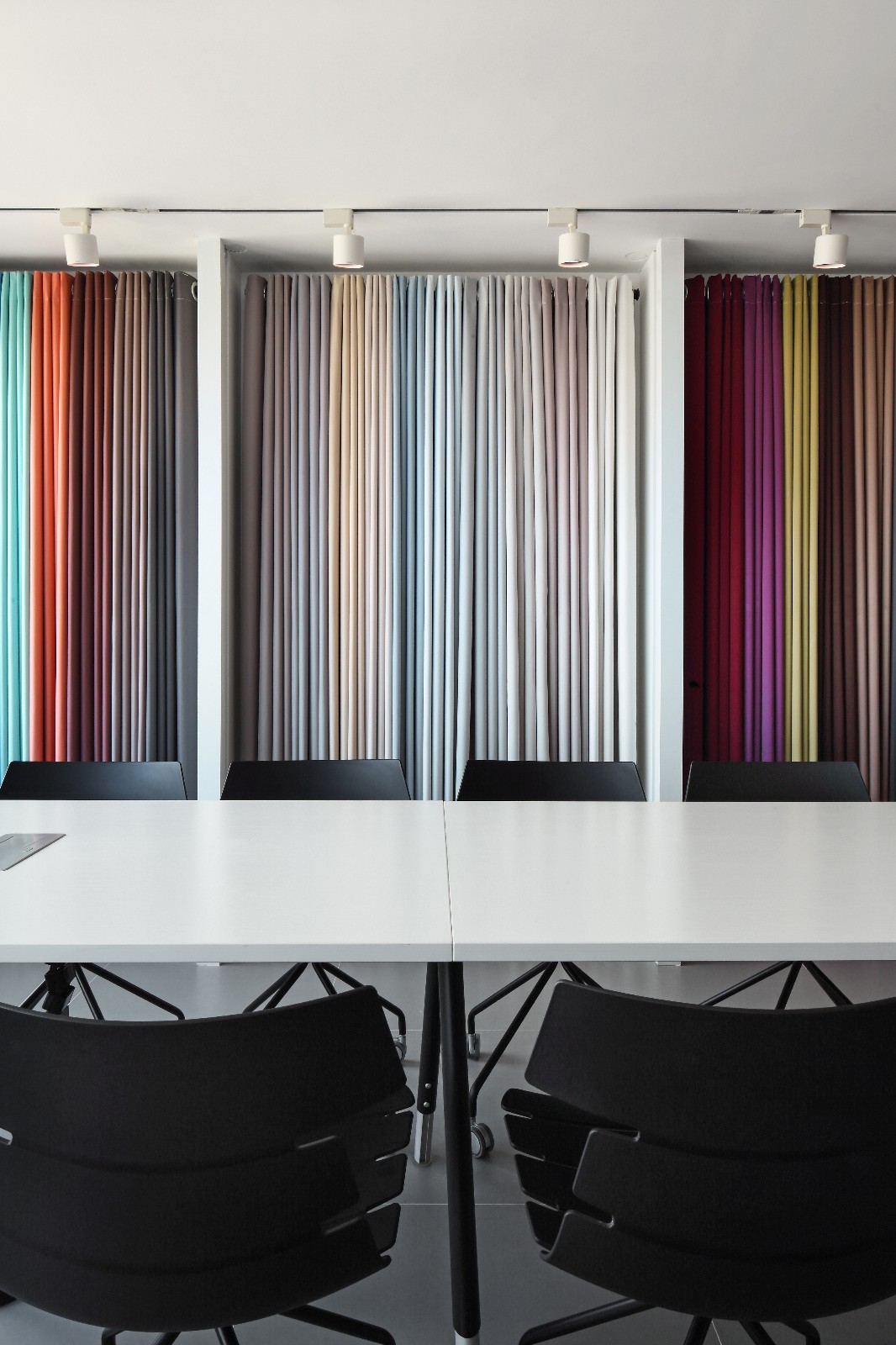沿着转折的烤漆玻璃墙绕过楼梯,左边是紧靠大楼窗户的员工区,右侧轻推一块门洞大小的玻璃墙,原来样品间兼会议室藏于此处。隐藏设计功能区的目的是规避众多的样品布料给人凌乱无序的感觉,同时保证会议的绝对安静和不被干扰。