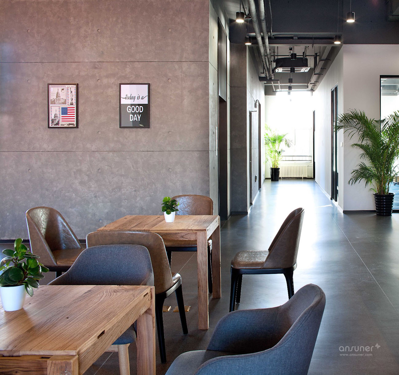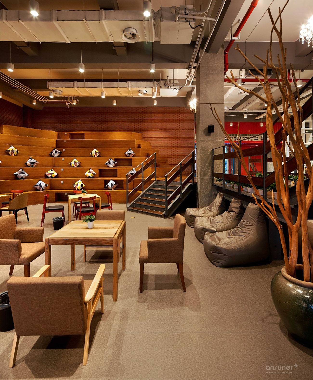 裸露的混凝土结构讲述着这里的历史,木材的质感传达出温暖与热情,绿植的点缀营造了舒适自然的环境。略带复古的氛围,让人能够瞬间放松心情。沉稳的铁艺栏杆穿插其间,既保证了使用功能,又成为环境中的勾勒与点缀。