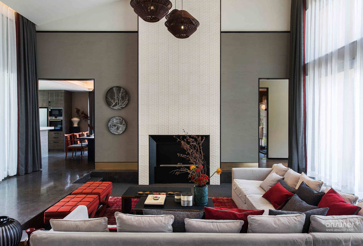 客厅:空间布局方正规整,用特别拘谨方整的艺术形式、刻线平整 、造型简单,以中国的“楷”,寻找中式艺术的“端正方整”,而粗犷的材质美把修饰降到最低,也回归到了最本质的自由。
