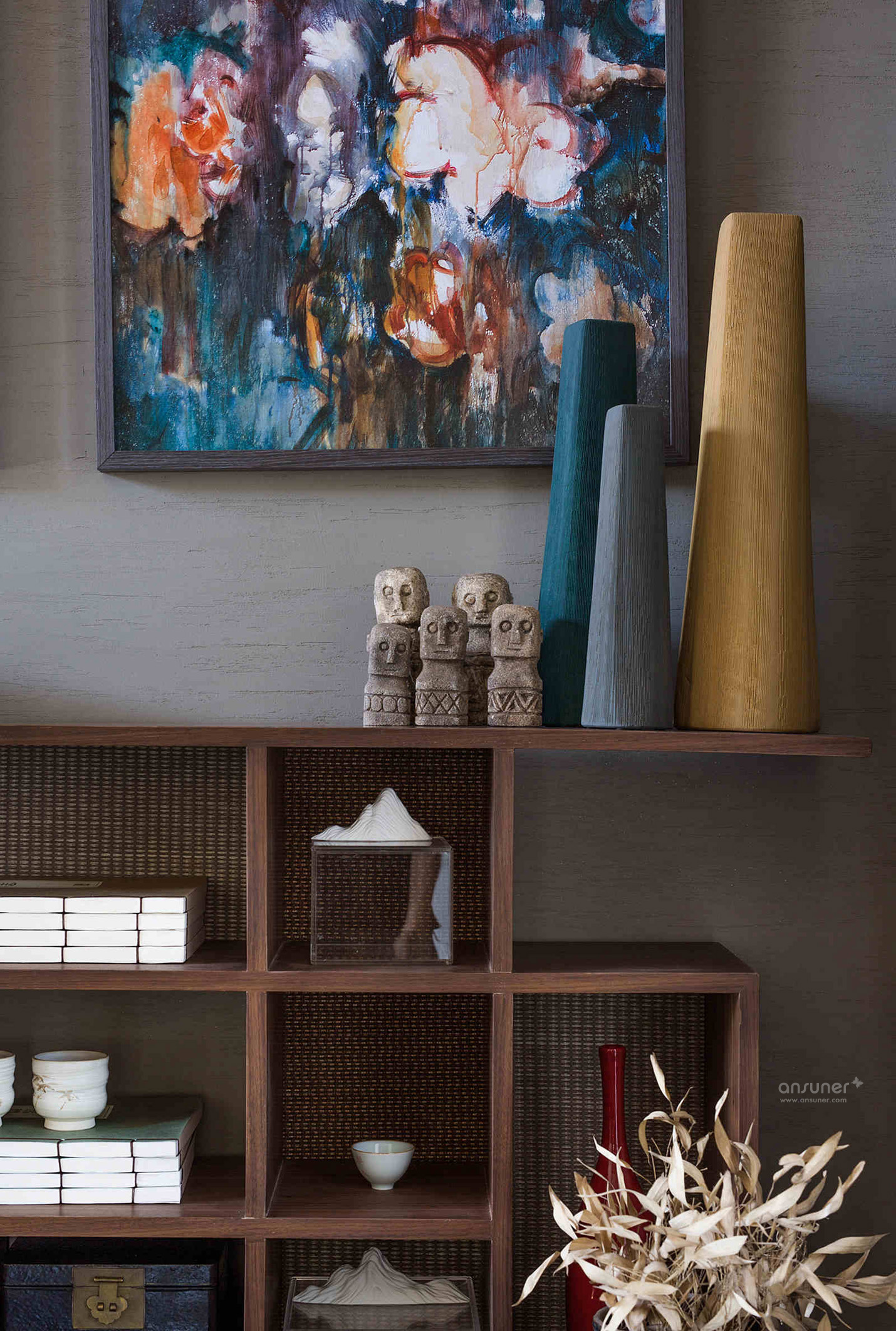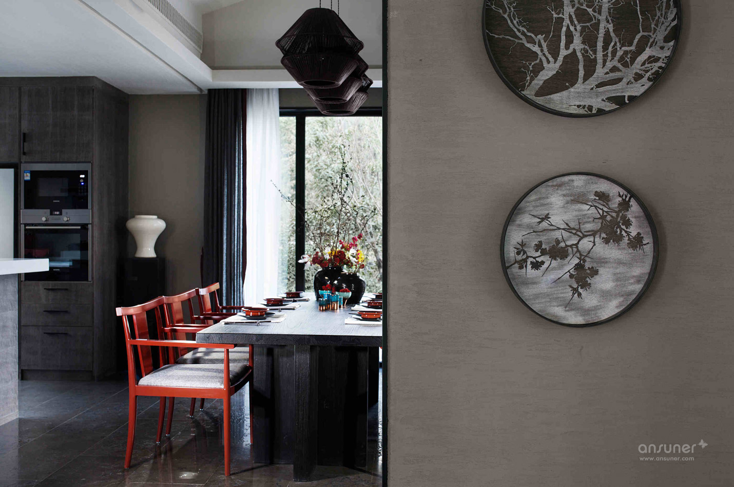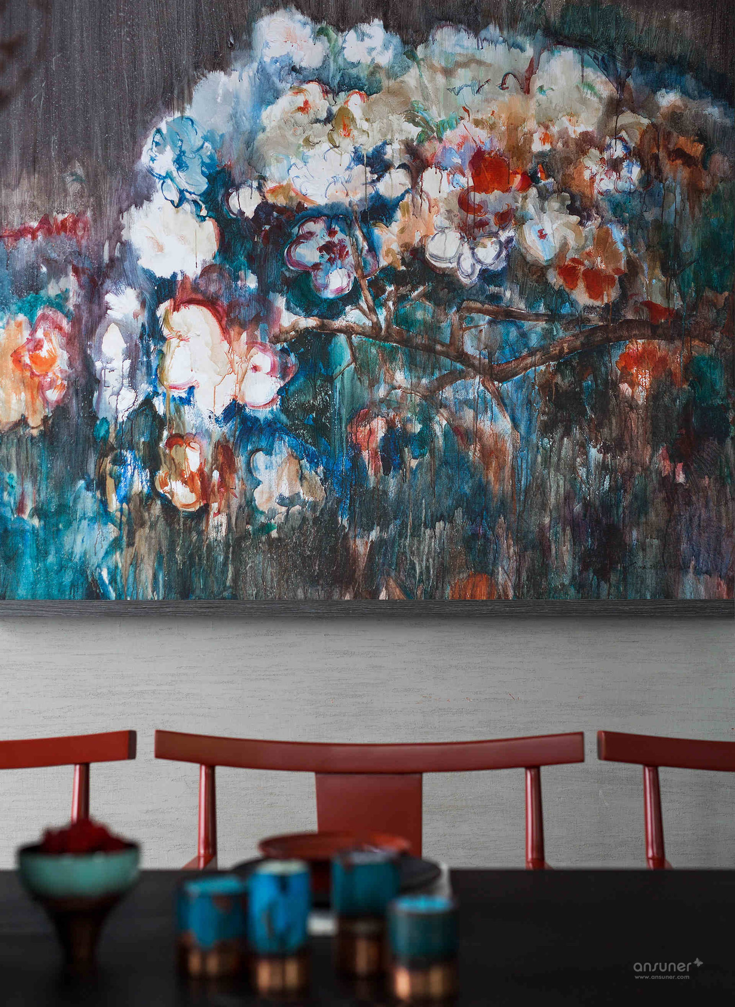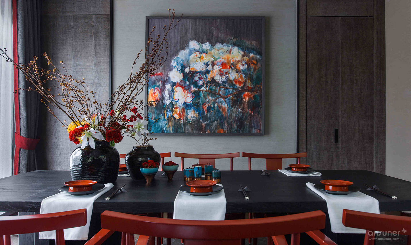 餐厅:餐厅延续了客厅的设计格调,捕获繁华绚烂中的一片宁静详和。青黑色的木桌、朱砂红的木制座椅、黑釉陶罐花樽,华体会体育官方在线官网运用意象叠加的手法,烘托出就餐区源自古老的韵味和踏实的生活情调。来自青年艺术家王志新的《花团锦簇》,极具张力的色彩与整个空间浑然一体。