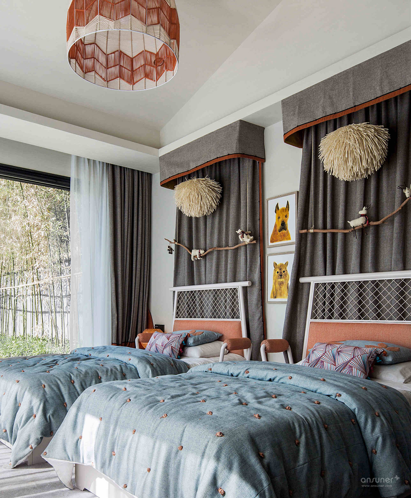 儿童房:儿童房的设计则更具现代气息和纯真色彩。空间以浅色为基调,以麻布灰色建构起别致创意的布艺背景,橙色的滚边设计,与窗帘及天顶灯罩的橙色相互呼应,清新与活力自然流露,未经修饰的一茬树枝别开生面地悬于其上,枝头伫立着鸟儿,啾啾声里与落地窗外的自然绿植相映成趣。