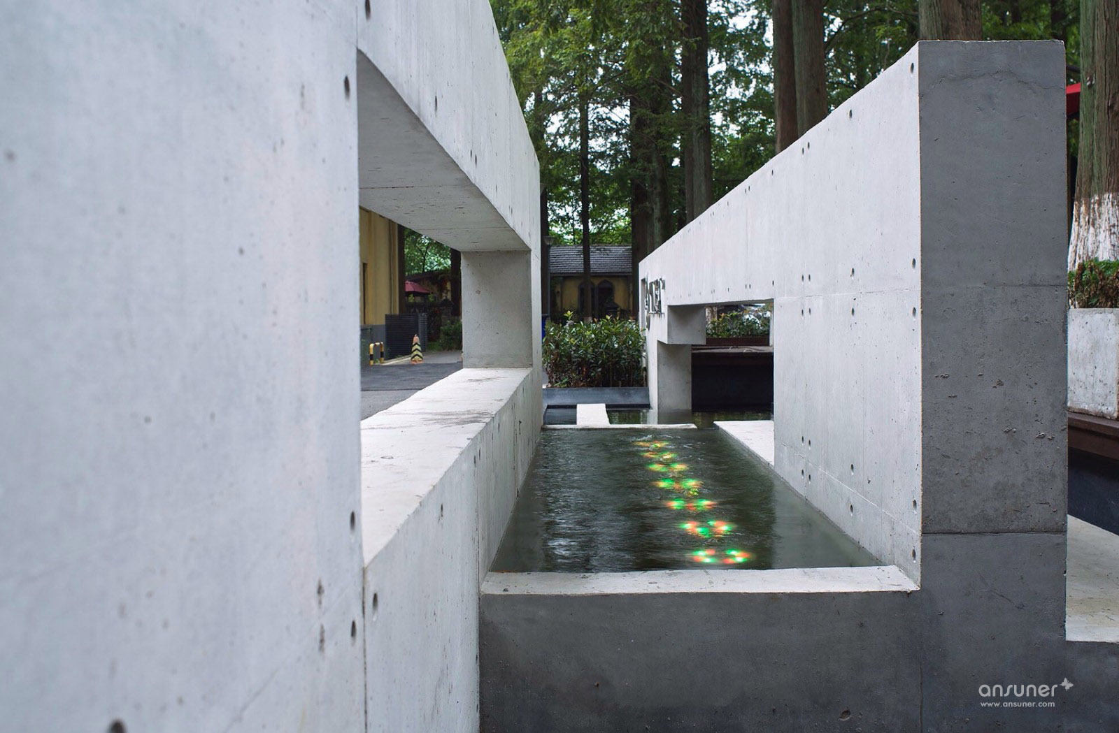 我们改造的建筑是7号楼,与前一栋建筑形成一个院落,与后期加建的一栋小建筑形成庭院,其中部分庭院被用作停车场,出现了车与人之间的混杂状况。建筑师利用清水混凝土矮墙,对场地进行重新梳理与整合,把车行与人行动线进行分离。在庭院内部隔离出一个公共性的聚集活动场所。虚与实的清水墙与叠水景观穿插在其中,形成趣味性的空间区隔。