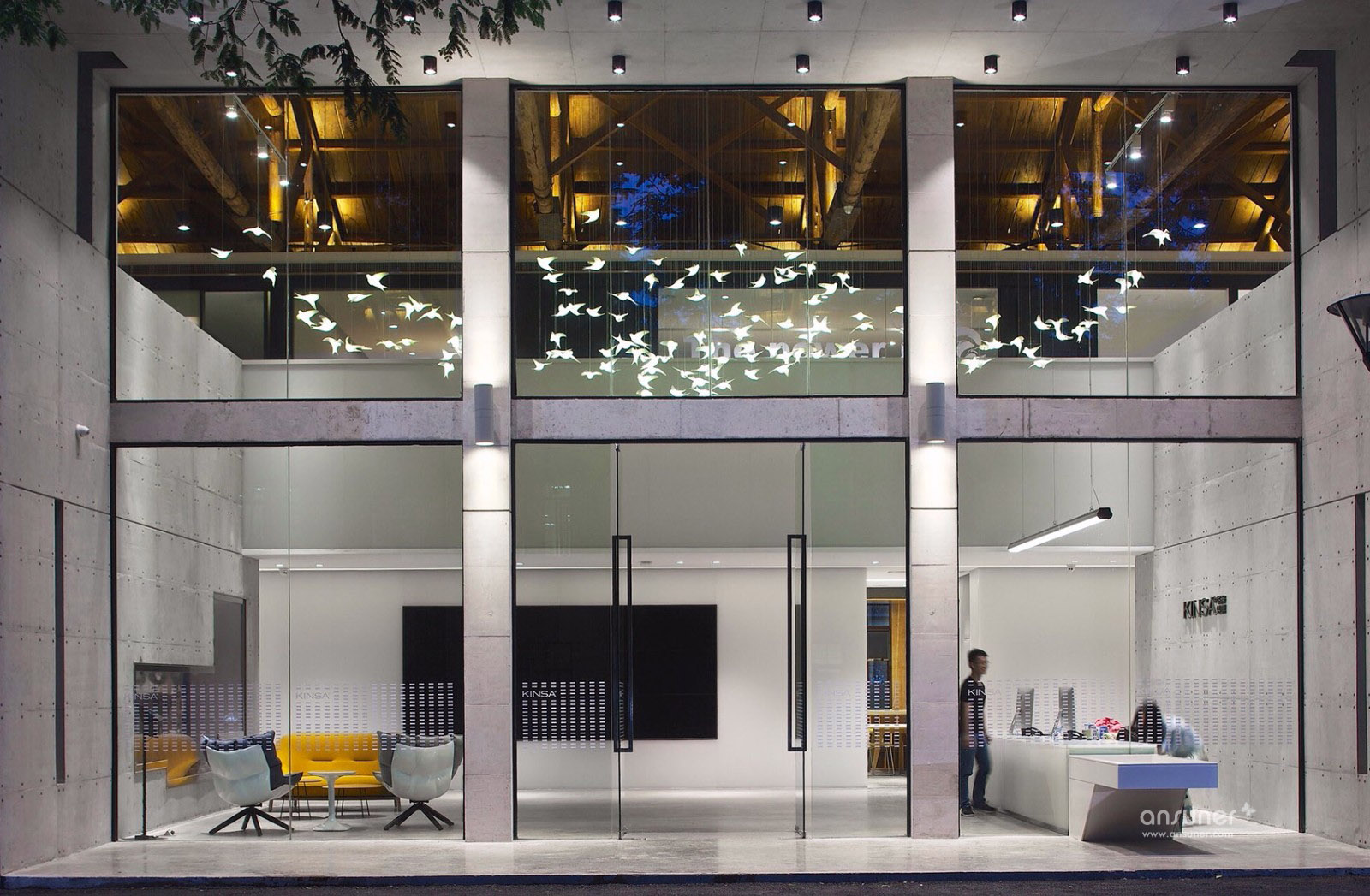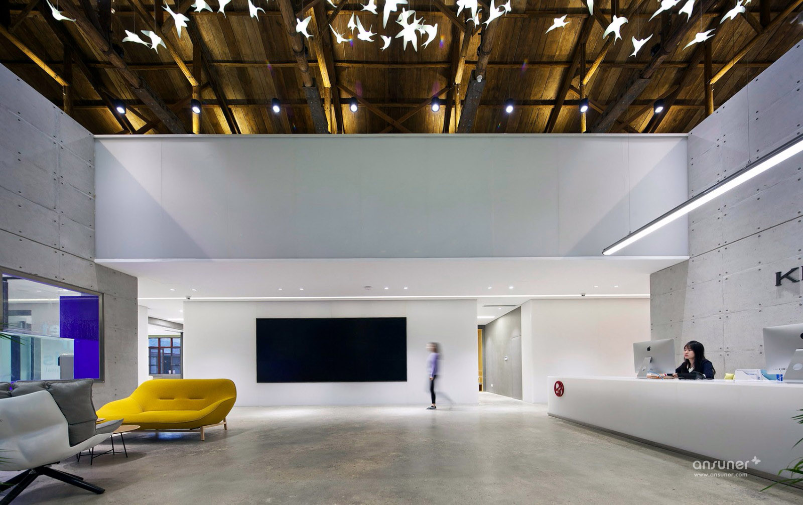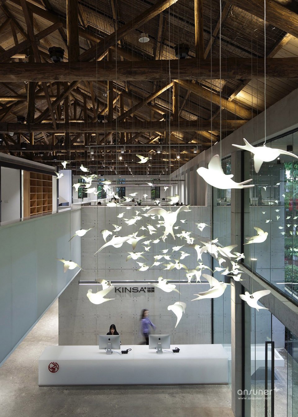 望板上的屋漏痕在诉说着一件件精彩的故事,经历了时间洗礼的望板,仿如一面宋画的绢布背景,若在望板上稍加点缀,寥寥数笔生灵与之交流,便可以形成一幅宋画意向,同时也与项目甲方诉求吻合,整个空间要有家的感觉。燕归巢是对家最贴切的诠释。我们的设计策略是对老建筑的精神延续与衍生,保持原有建筑空间的质量,而不是生猛的冲突。木桁架经过时间的洗礼,斑驳中有时间的印迹,与树脂板建筑材料之间的微妙碰撞,造就了时光交错的印象。我们寻找原来的建筑结构的逻辑,增加剪力墙与柱梁来对原有墙面与屋顶进行加固。同样利用了清水混凝土做结构并摒弃装饰面,让建筑语言之间交流更为流畅。建筑与自然之间的有趣的边界称之为灰空间,建筑的主入口正是这样的模糊边界空间。水杉树庭院与室外庭院,主入口之间形成这种叙事关系。
