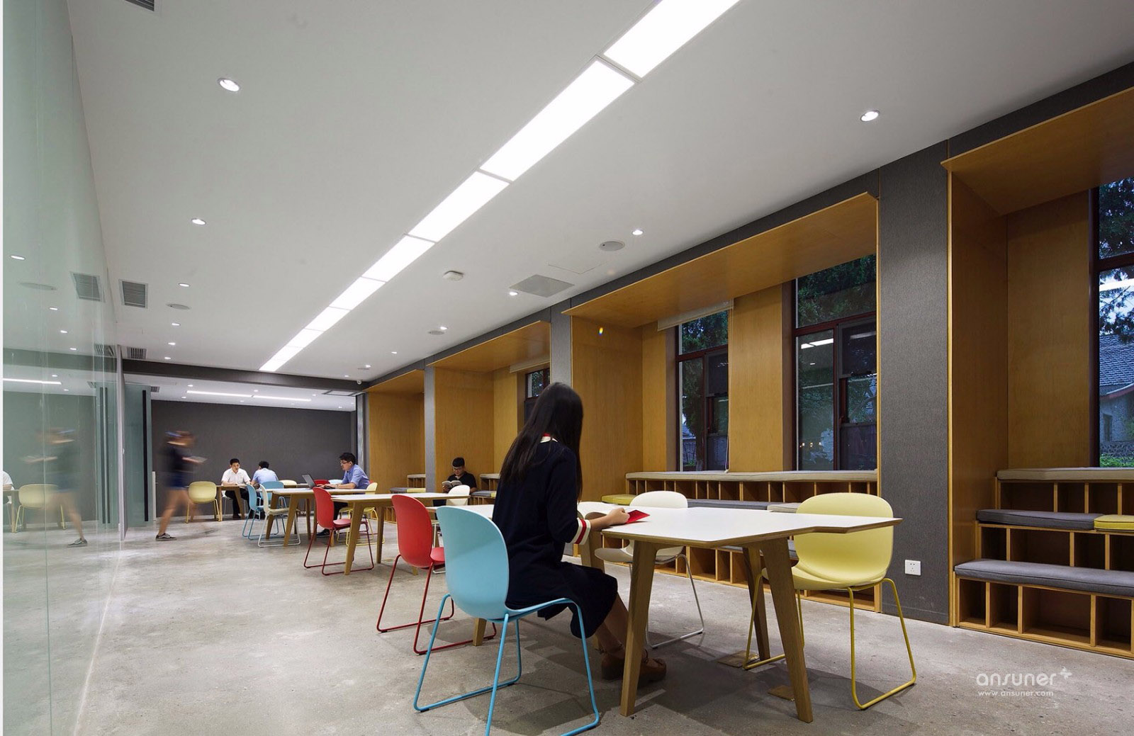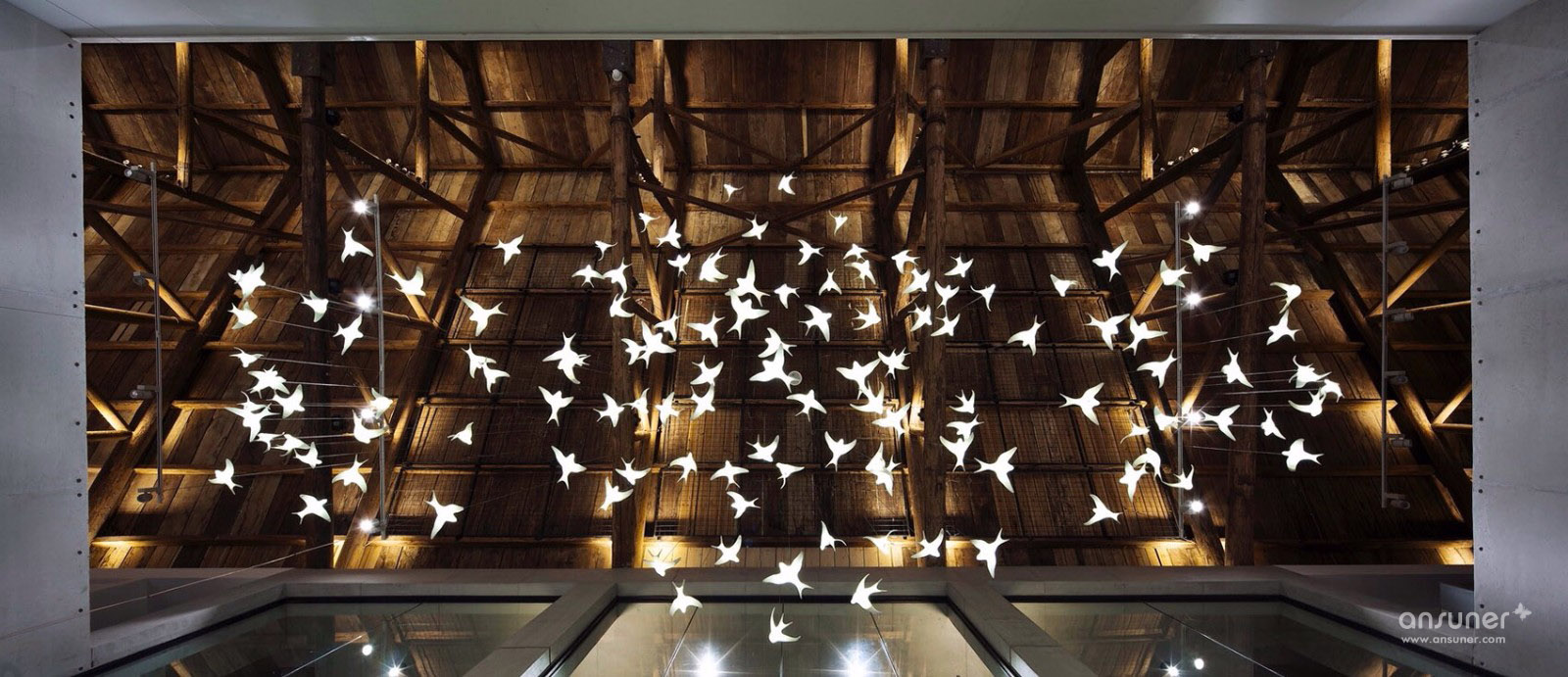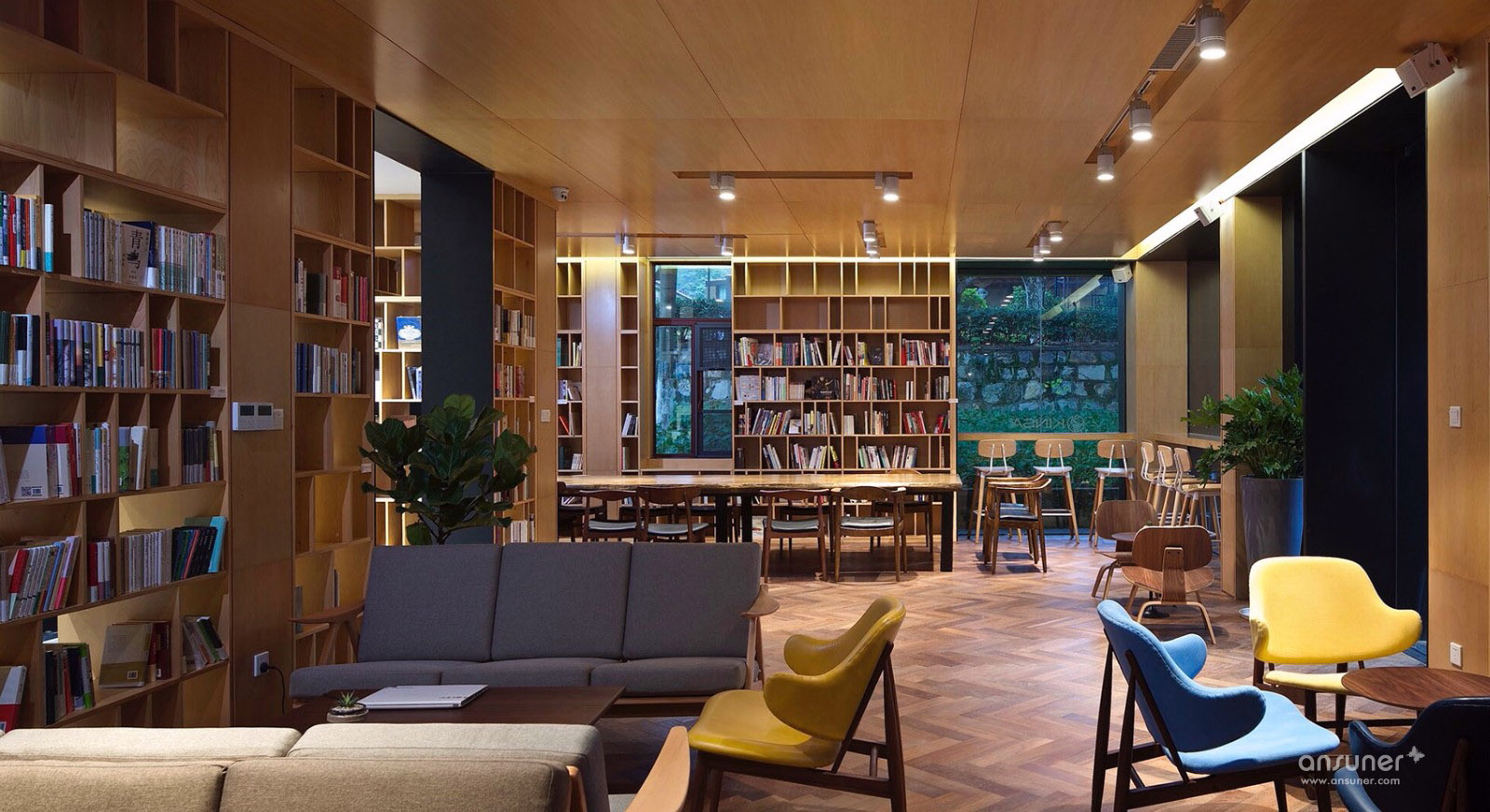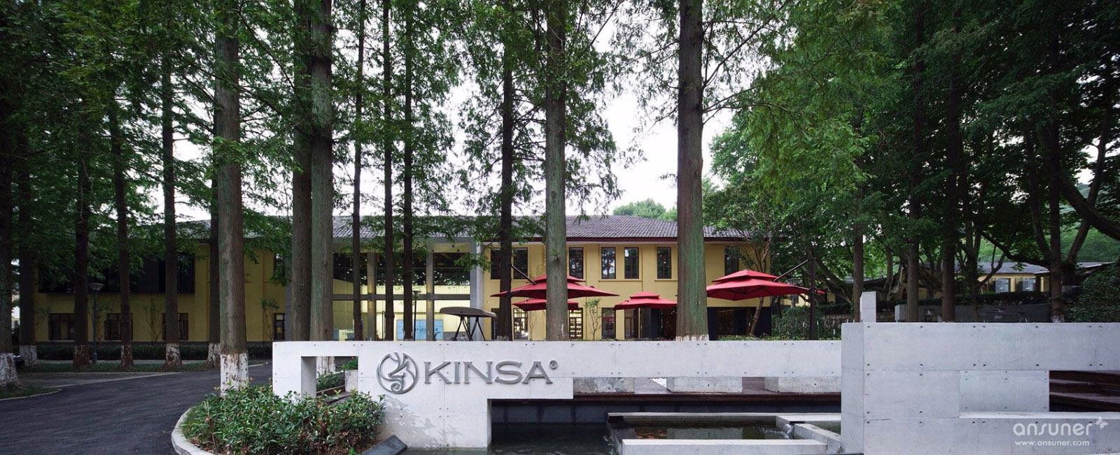 望板上的屋漏痕在诉说着一件件精彩的故事,经历了时间洗礼的望板,仿如一面宋画的绢布背景,若在望板上稍加点缀,寥寥数笔生灵与之交流,便可以形成一幅宋画意向,同时也与项目甲方诉求吻合,整个空间要有家的感觉。燕归巢是对家最贴切的诠释。我们的设计策略是对老建筑的精神延续与衍生,保持原有建筑空间的质量,而不是生猛的冲突。木桁架经过时间的洗礼,斑驳中有时间的印迹,与树脂板建筑材料之间的微妙碰撞,造就了时光交错的印象。我们寻找原来的建筑结构的逻辑,增加剪力墙与柱梁来对原有墙面与屋顶进行加固。同样利用了清水混凝土做结构并摒弃装饰面,让建筑语言之间交流更为流畅。建筑与自然之间的有趣的边界称之为灰空间,建筑的主入口正是这样的模糊边界空间。水杉树庭院与室外庭院,主入口之间形成这种叙事关系。